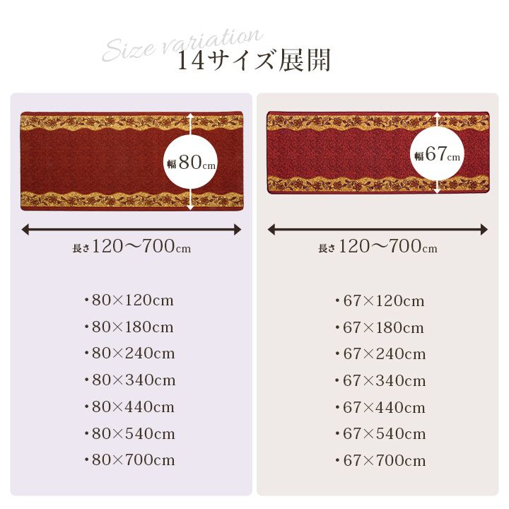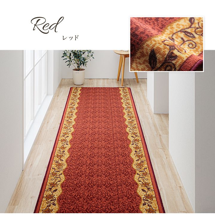 | クラシカルな印象の上品な商品です。廊下敷きとしても、キッチンマットとしてもご使用頂けます。表地には丈夫で汚れにくいナイロンを使用しているため耐久性にも優れた商品です。裏面にはすべりにくい加工を施しています。 |
