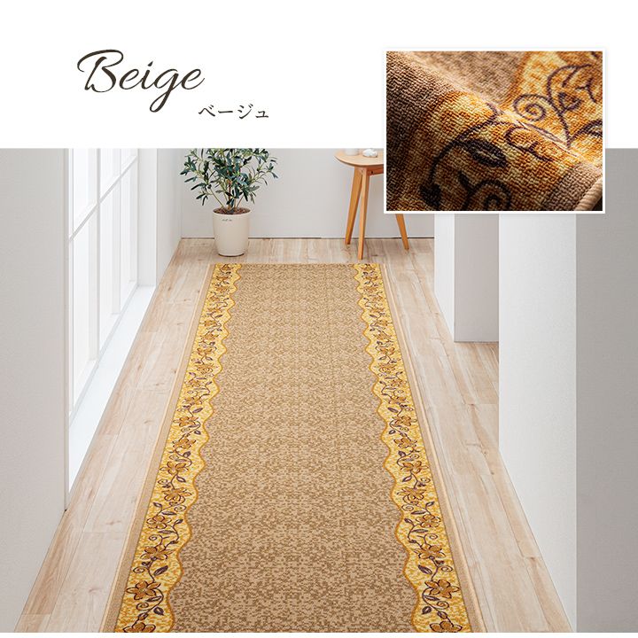 | クラシカルな印象の上品な商品です。廊下敷きとしても、キッチンマットとしてもご使用頂けます。表地には丈夫で汚れにくいナイロンを使用しているため耐久性にも優れた商品です。裏面にはすべりにくい加工を施しています。 |