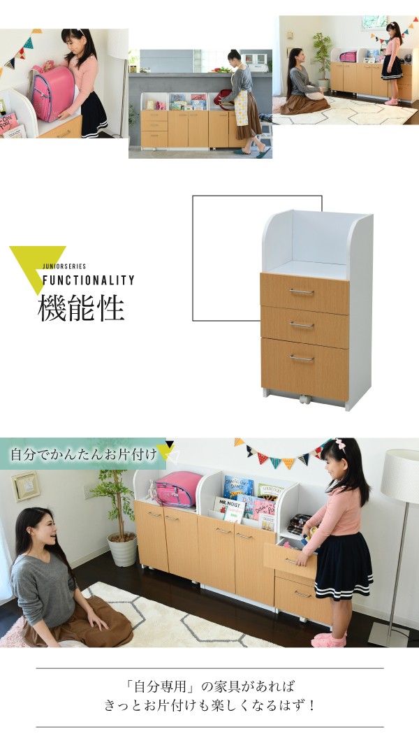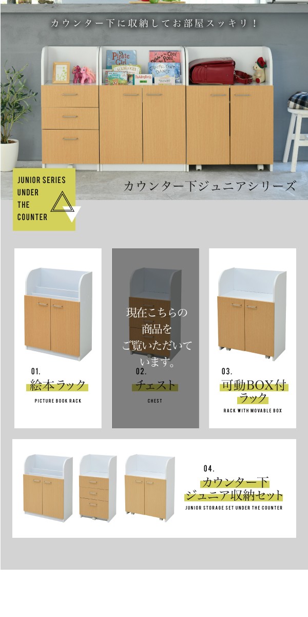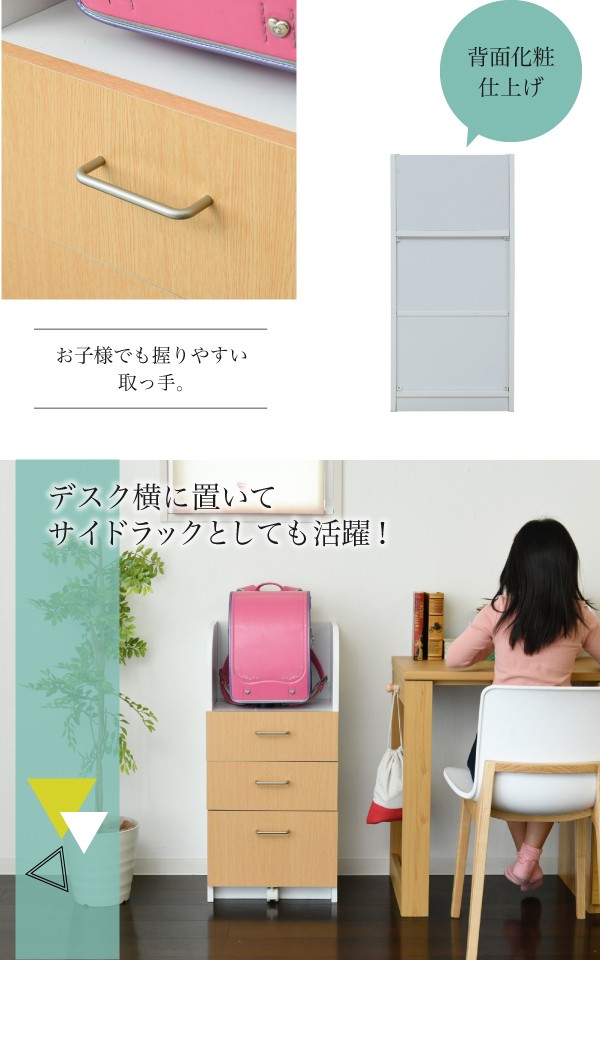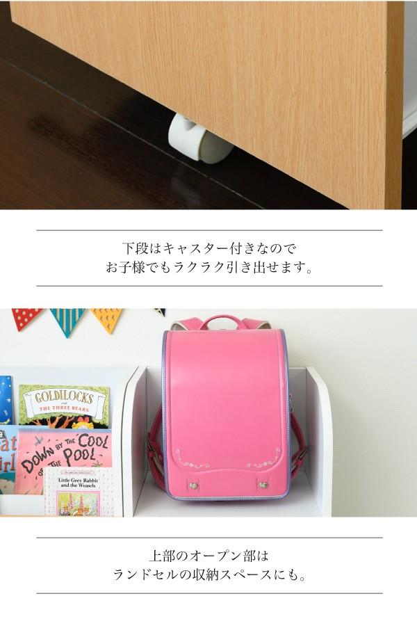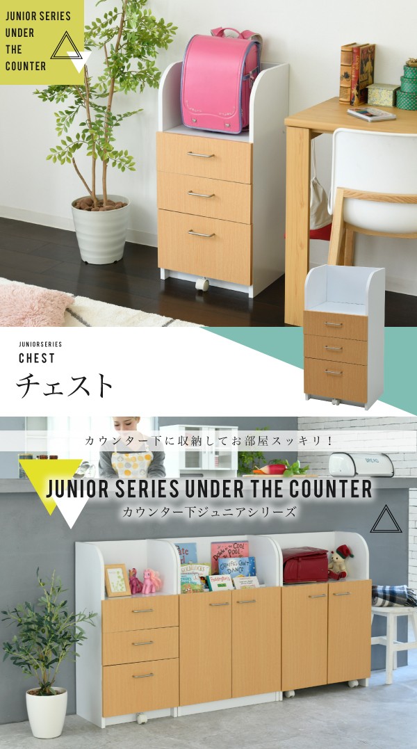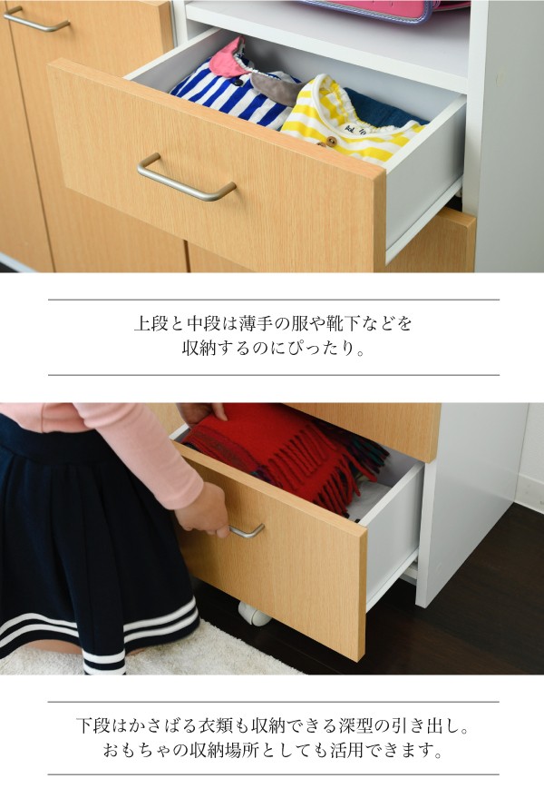 カウンター下に収納できるチェスト。大小3段の引き出しに小物やおもちゃ、お洋服などが収納できます。それぞれ使い分けることで、お子様がお片付け習慣を身に付けるきっかけに下段はキャスター付きなのでたくさん収納しても開閉楽々。