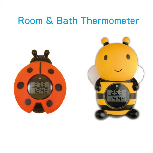 みつばちとてんとう虫のモチーフが可愛い、赤ちゃんの沐浴やお風呂に便利な湯温計です。