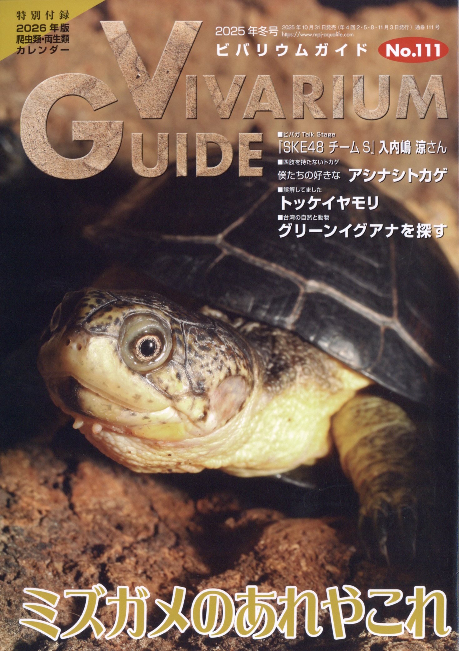 巻頭特集は『水棲ガメ』です。小型種も多く飼育しやすく、甲羅から覗くカワイイ表情などから爬虫類の中でも人気の高い水棲ガメ。流通種のカタログや飼育する上での注意点、さらには繁殖方法の解説など、水棲ガメのすべてがわかる特集です。また、特別付録として毎年恒例のカレンダーが今年も付いてきます。毎月爬虫類&両生類の写真が楽しめる他にはない唯一のカレンダーです!