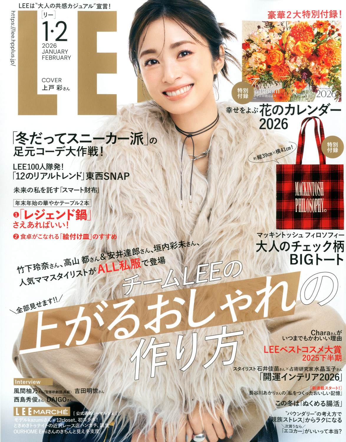 表紙/上戸 彩さん2大豪華特別付録1 LEEオリジナルカレンダー2026幸せをよぶ花ごよみ2 マッキントッシュ フィロソフィー大人のチェック柄BIGトート※約縦39cm×横41cm※コンパクト版にはBIGトートはついていません。ファッション大特集は、竹下玲奈さん、高山都さん&安井達郎さん、垣内彩未さん、人気ママスタイリストがALL私服で登場全部見せます!!チームLEEの「上がるおしゃれの作り方」美容では、LEEベストコスメ大賞2025下半期年末年始の華やかテーブル2大特集として(1)胸を張ってふるまえる「レジェンド鍋」さえあればいい!(2)食卓がこなれる「絵付け皿」のすすめ読み物はぬくめる「腸活」でこの冬は体調を崩さない!「バウンダリー」の考え方で、親族ストレスからラクになるなど、年末年始におしゃれもおうち時間も楽しくなる企画が勢ぞろいです!