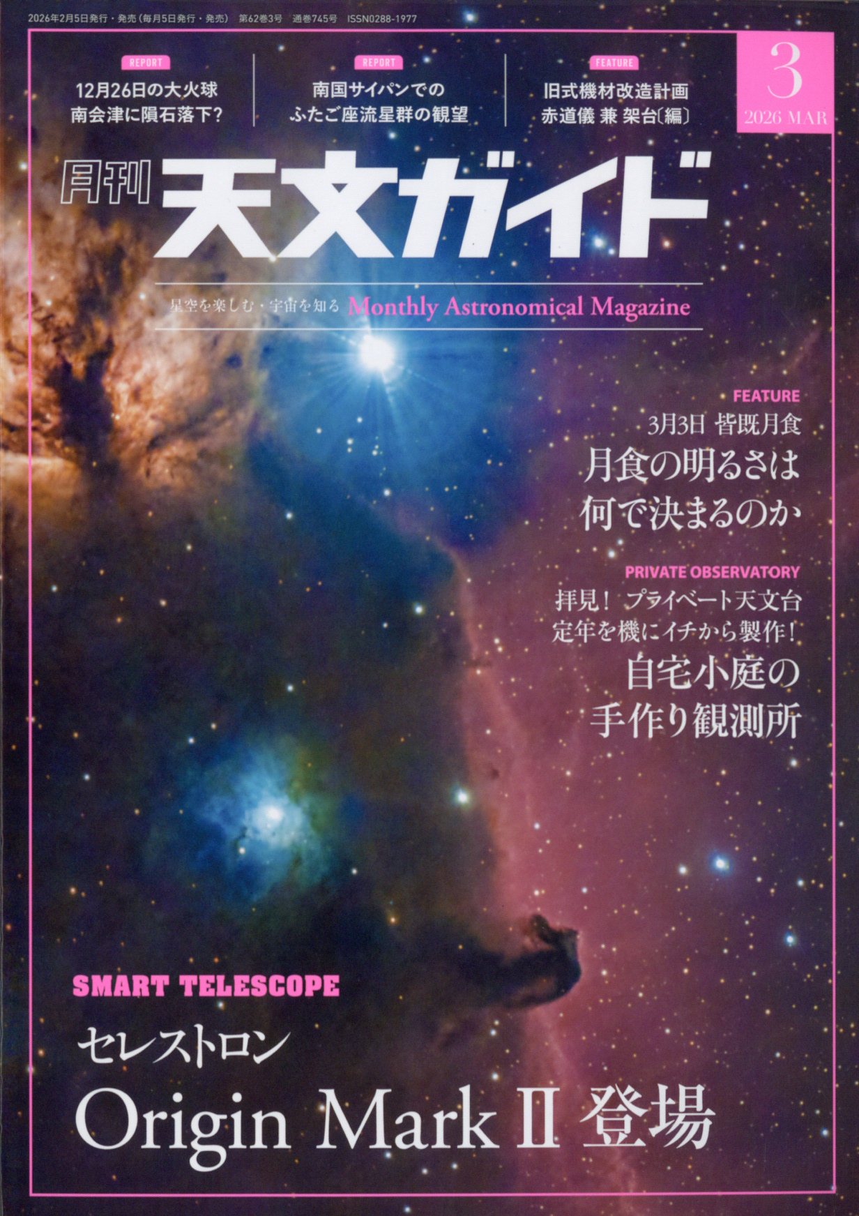 ■スマート望遠鏡「Origin Mark II Intelligent Home Observatory」: セレストロンから発売されたスマート望遠鏡「Origin Mark II Intelligent Home Observatory」は、口径152mm・RASA光学系の天体撮像に威力を発揮する明るい光学系と、セットアップも専用アプリにより簡単に完了。さらにAIを導入した画像処理や画像共有までが可能な、ハイアマチュア注目のスマート望遠鏡です。 天体写真家の沼澤茂美さんが「Origin Mark II Intelligent Home Observatory」で、代表的な天体を撮影し、その画像とともに望遠鏡についてレポートします。■3月3日に起こる皆既月食と皆既食中の月の明るさ: 3月3日の宵に、日本全国で皆既月食が起こります。月は18時50分に東の空で月は欠け始め、20時04分には皆既食となります。皆既食は21時03分に終わり、その後は月は元の姿にもどっていき、22時18分に部分食が終わります。今回の皆既月食は観察しやすく、観測のポイントを解説します。 また、皆既食中の赤銅色の月の明るさが毎回異なりますが、この明るさの違いについては、あまり解説されたことがありませんでした。そこで、これまでに起こった皆既月食の条件を比較して解説、さらに今回の皆既月食の明るさを予測します。■サイパンでふたご座流星群: 12月のふたご座流星群の観測といえば、寒さで凍えながら辛抱強く行うものが常でしたが、暖かく乾季に当たる「サイパン」で、ふたご座流星群の観測と撮影を目的とした、現地発の「ふたご座流星群観測ツアー」が実施されました。夜間、車で立ち入れない青の洞窟こと「グロット」を特別開放して行った、ふたご座流星群観望ツアーの様子を紹介します。