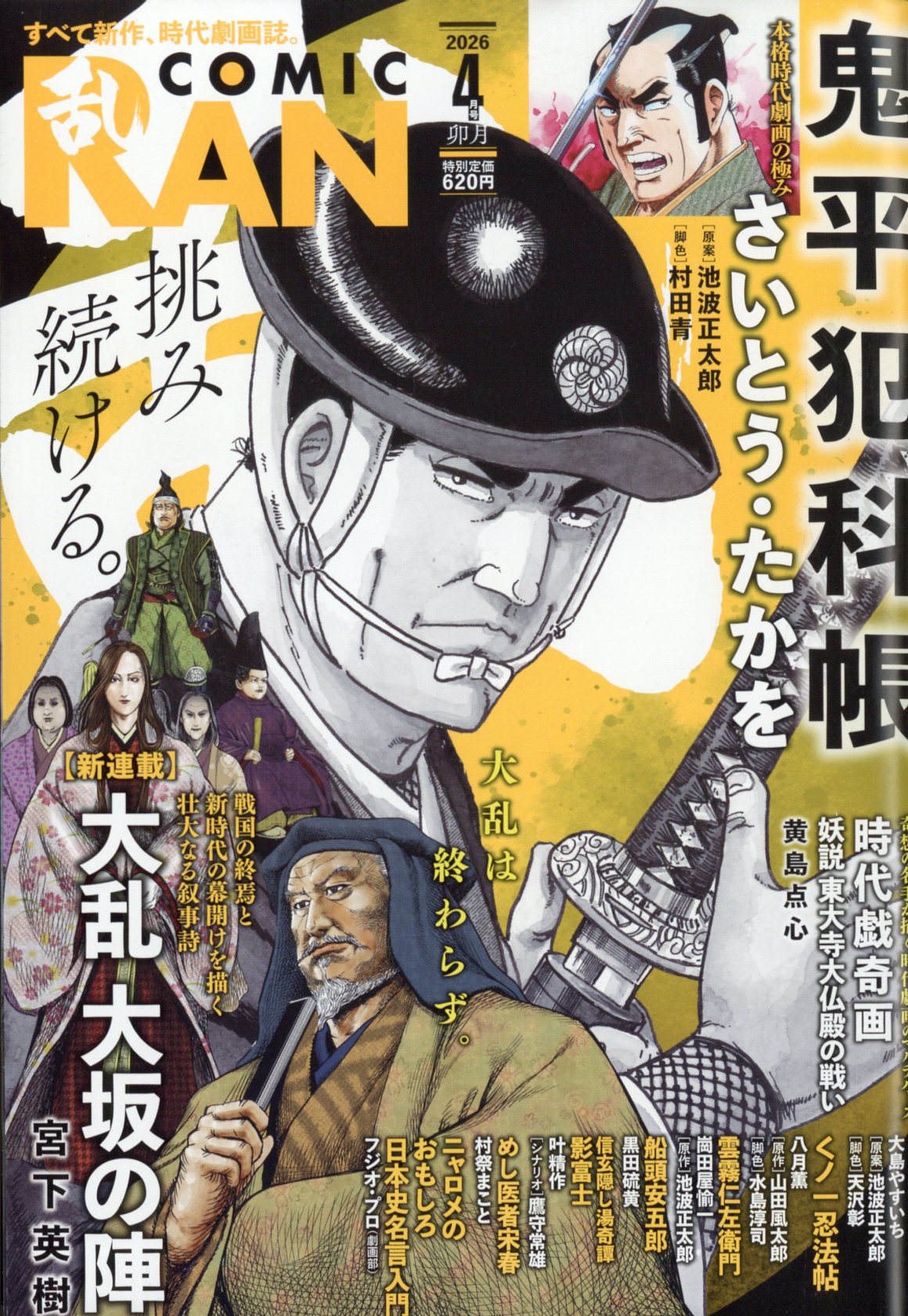 宮下英樹による「大乱大阪の陣」連載スタート!劇画家さいとう・たかをによる「鬼平犯科帳」同じく池波正太郎原作の「剣客商売」をベテラン大島やすいちが、活写いたします。崗田屋愉一の「雲霧仁左衛門」八月薫「くノ一忍法帳」叶精作「信玄隠し湯奇譚他影富士」黒田硫黄「船頭安五郎」ニャロメのおもしろ日本史名言入門、ほか盛沢山でお届けいたします。※連載作品は予告無く変更となる場合がございます。