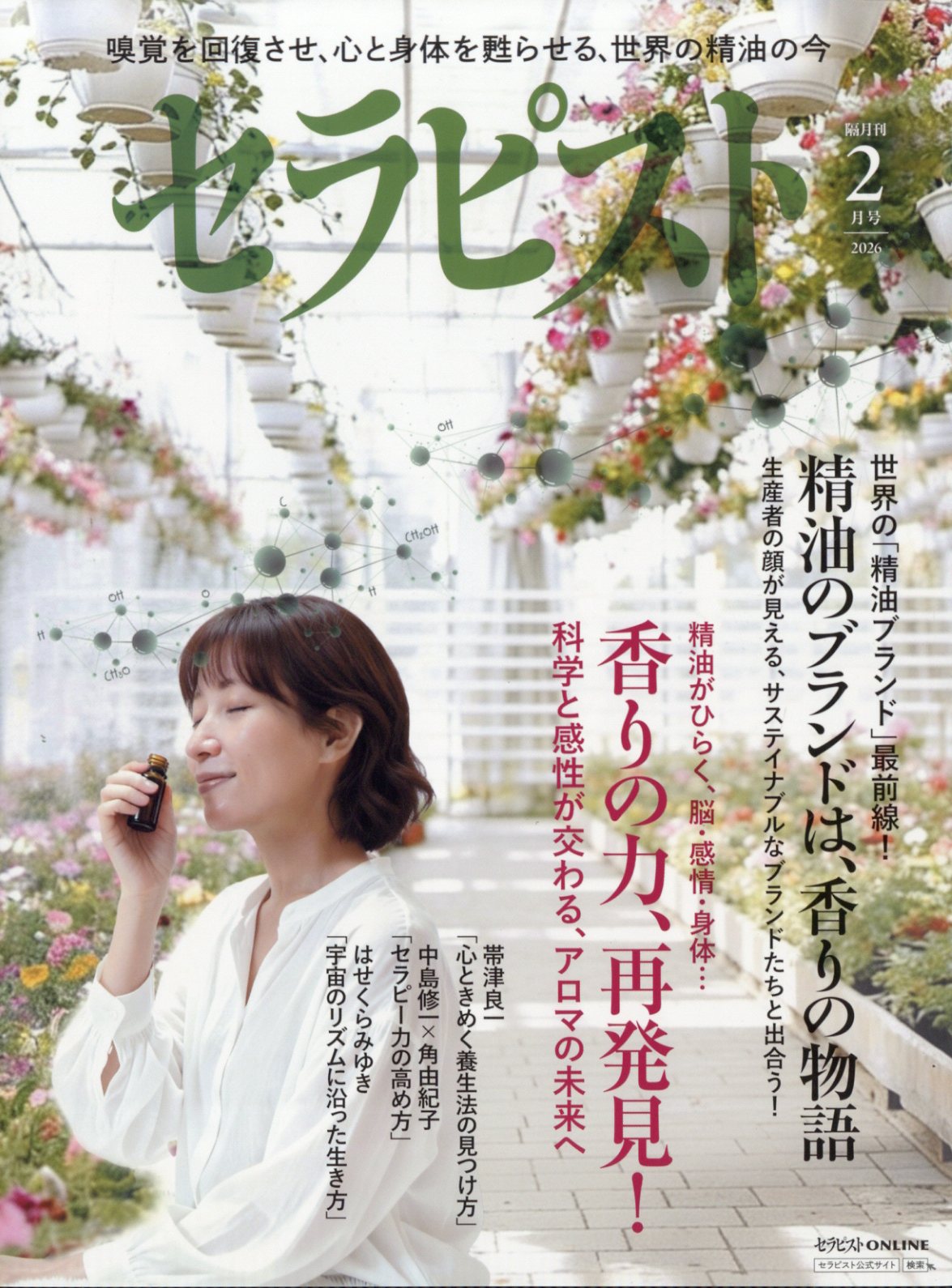 第一特集;香りの力、再発見!?嗅覚を取り戻す、アロマテラピーの大いなる可能性?新型コロナを経て、「嗅覚の重要性」が再認識されている。そこで、精油が脳や感情に与える影響を科学的エビデンスに基づき考察。精油の薬理作用に関するレポートや、嗅覚アプローチに成功したセラピストのケースを紹介しながら、アロマセラピストのこれからの役割に迫ります。第二特集;世界の精油ブランド大集合!?なぜ今、海外のブランドが選ばれるのか??プロのセラピストだからこそ知りたい、海外の精油ブランド。蒸溜所における製造哲学、ガスクロマトグラフィー分析データの読み方から、正規代理店として輸入販売を始めるための方法までを徹底取材。サロンのメニューを刷新するヒントが満載の特集です。