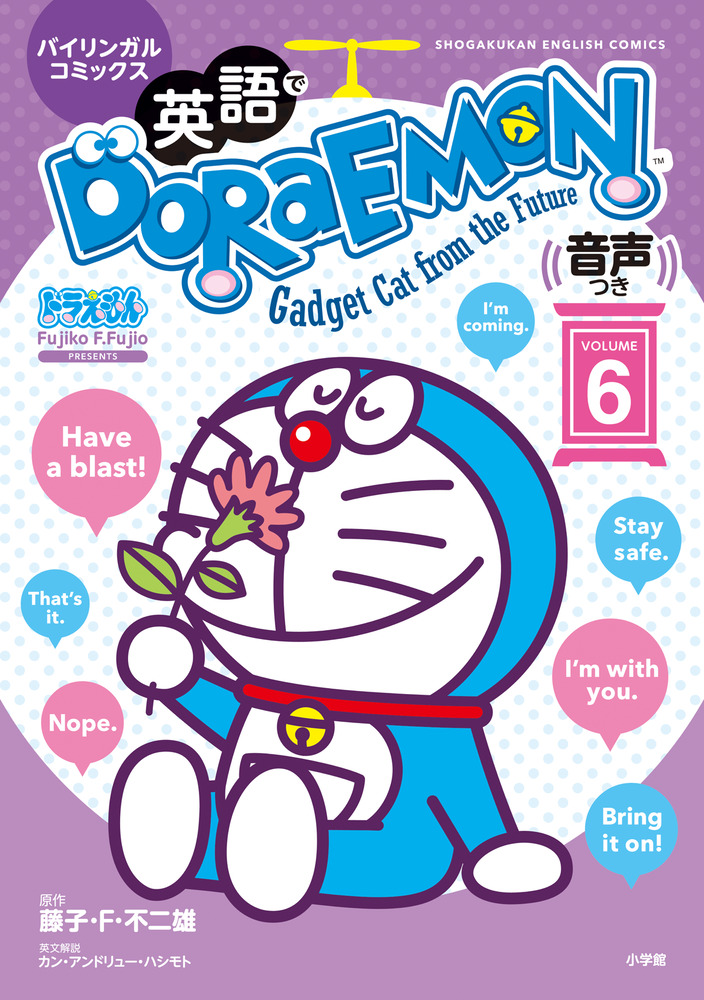 各ページの二次元バーコードをスマホで読み込めば、コミックの英語セリフと関連表現をネイティブスピーカーの英語で聞くことができます。「ドラえもん」の登場人物は主に小学生ですが、登場する英語は年齢を問わずネイティブスピーカーが日常使うものばかり。すぐに役立つ表現が満載です。