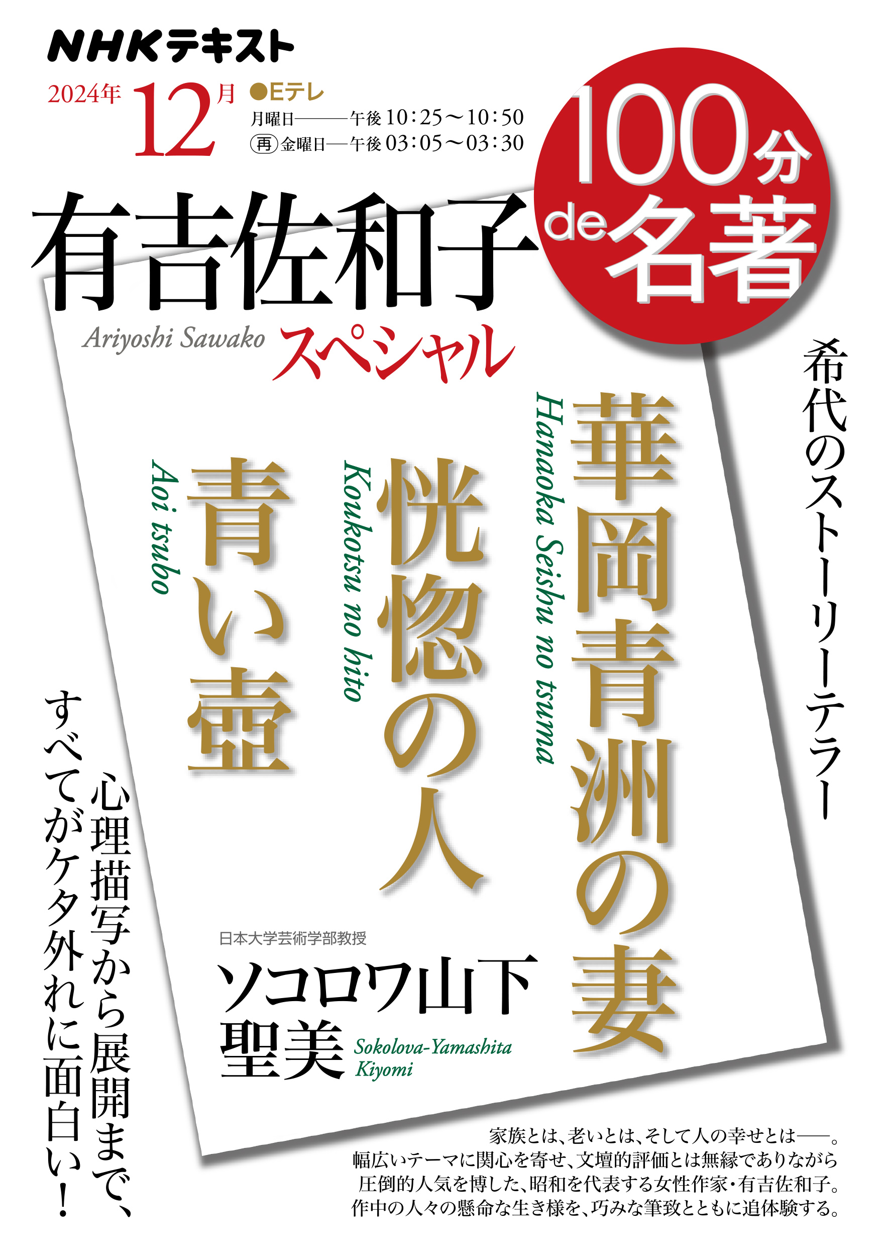 江戸時代の医家で繰り広げられる嫁姑争いを描いた『華岡青洲の妻』、経済成長期のさなかに高齢化の問題をあぶり出した『恍惚の人』、日常を生きる人々の機微を鮮やかに映し出した『青い壺』を題材に、「家」「老い」「幸せ」といった現代に共通するテーマを穿つ、女性たちの辛辣で、しなやかな語りを味わう。