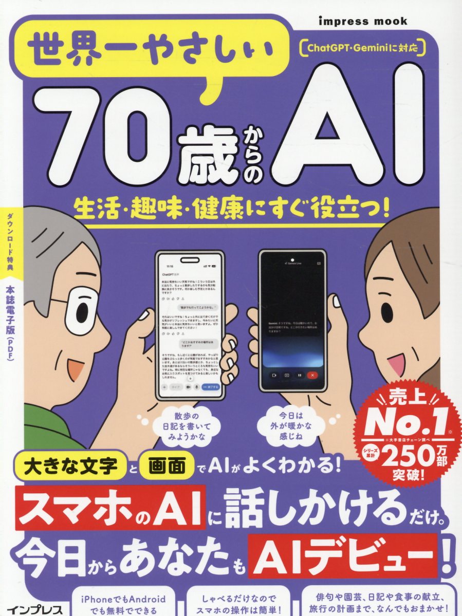 シリーズ累計250万部突破の「世界一やさしい」最新刊は、サブシリーズ「70歳からの○○」第2弾!!◆スマートフォンでのChatGPT/Geminiアプリの使い方を「1トピック・1〜2ページ」で展開し、「縦書き」「大きな文字」「写真・図版の多用」で、シニアでも無理なく読める誌面を実現しました。はじめにアプリのインストールやアカウント登録といった基本操作を丁寧に解説したうえで、生活の中で役立つ具体的なシーンを短編形式で紹介します。▼想定シーン例 【趣味】囲碁・将棋の研究、俳句や短歌の創作支援、生け花のアイデア相談、旅行プランづくり 【生活】料理レシピ相談、買い物の工夫、健康に関するちょっとした情報収集 【心の支え】雑談や昔話を聞いてもらう、孤独感を和らげる会話相手としての活用