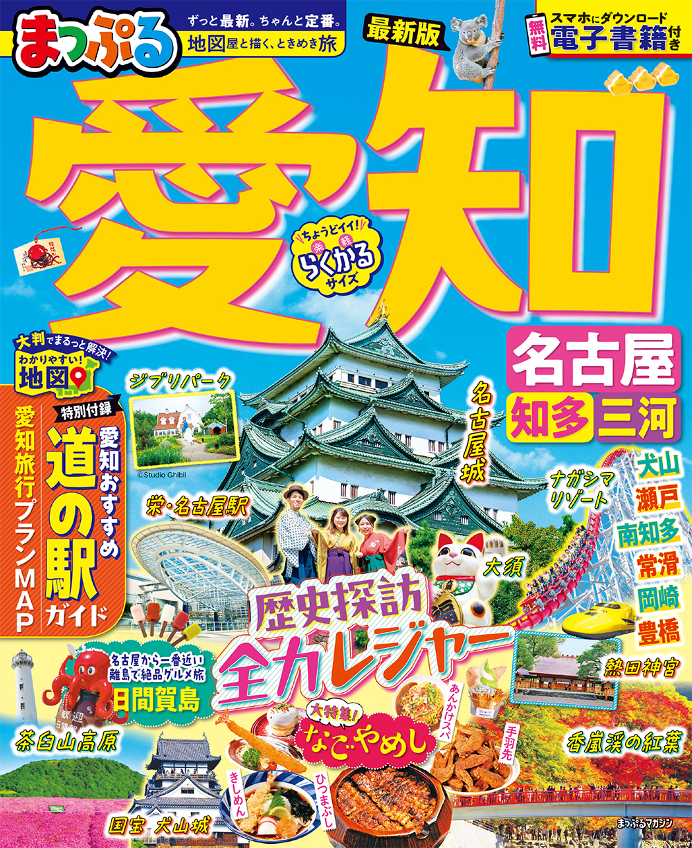 付録は愛知県の観光名所が一目でわかる便利な地図と、道の駅情報が掲載された大判付録!名古屋エリア紹介では、でらうま「なごやめし」を巻頭大特集。名古屋城、熱田神宮、東山動植物園、名古屋港水族館、ジブリパーク、ナガシマリゾートなど名古屋周辺の人気スポットも紹介します。郊外エリアは、犬山城周辺、瀬戸、常滑、知多半島、渥美半島、豊川稲荷なども徹底ナビ。愛知をまるごと楽しめる1冊です。