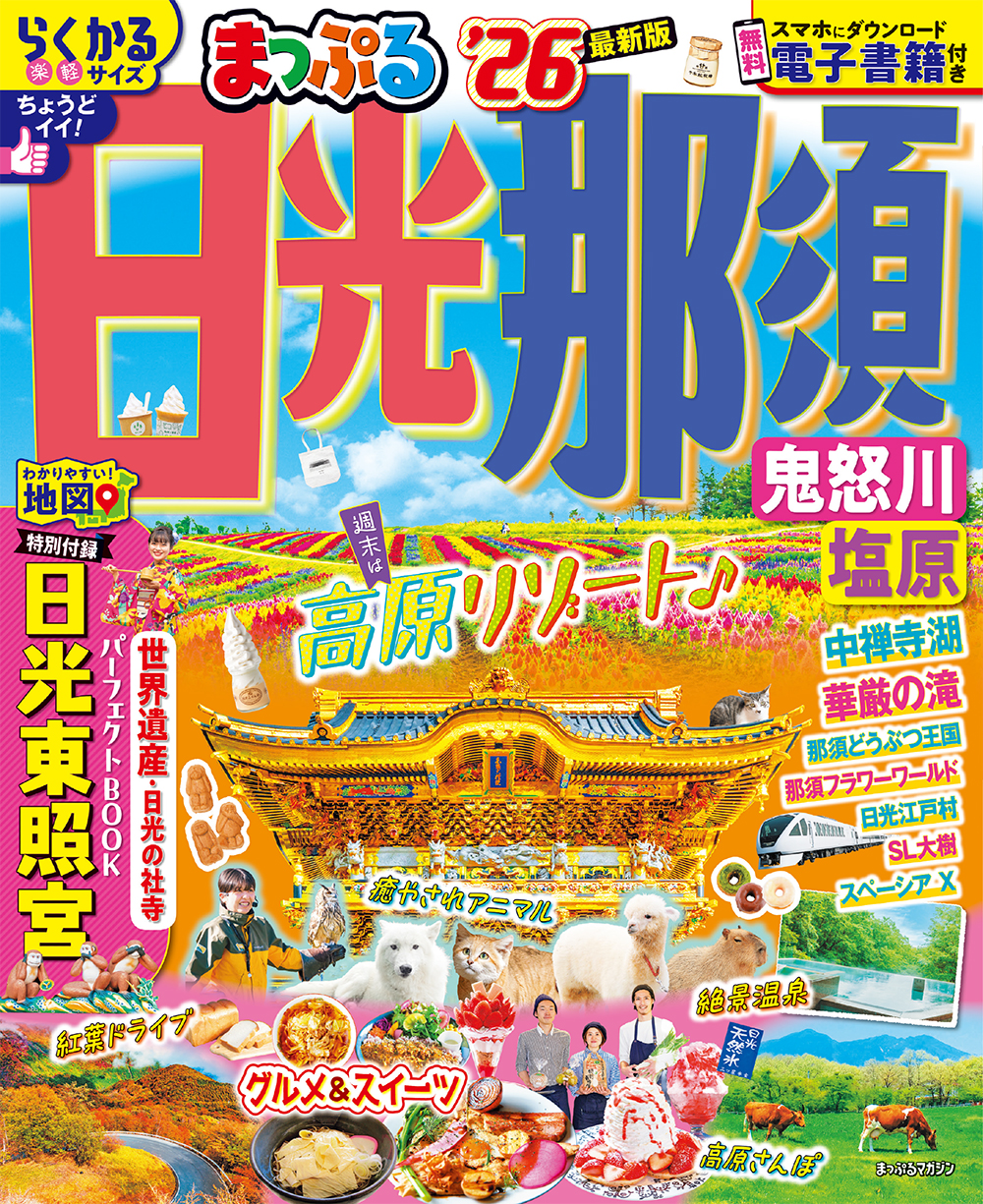 日光・那須エリアの魅力を9つのキーワードでギュギュっとまとめた巻頭グラビア特集。旅のメインイベントになる目的探しに超便利です。「絶景」「世界遺産」「紅葉」「グルメ&スイーツ」「オールインクルーシブ宿」「癒やされアニマル」「アートスポット」「わくわく体験」「温泉」のテーマで、今行きたい日光那須を、伝えます。