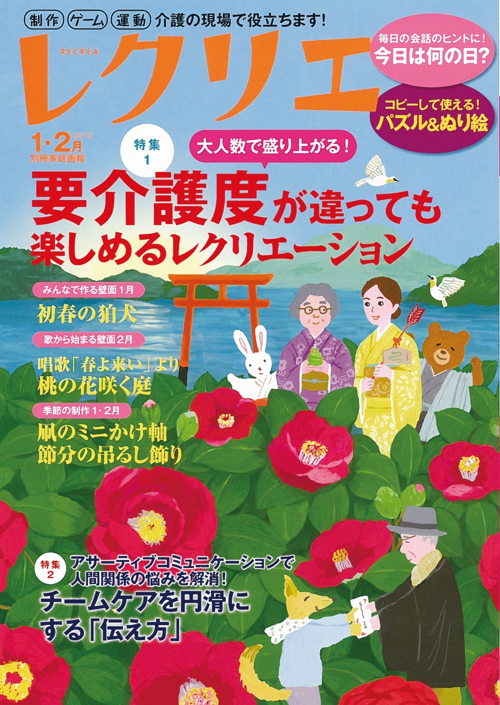 高齢者介護施設で働く介護職のためのレクリエーション情報誌。大人気の壁面や季節の制作、ゲームレクなど、介護の現場で求められるレクのアイデアに、音楽、料理、認知症ケアなど幅広い分野を網羅。ぬり絵やまちがいさがしなどのパズルも充実。今号の壁面は、お正月にふさわしい狛犬の壁面と、唱歌「春よ来い」を題材にした壁面の2本立て。特集1では「大人数で要介護度が違っても楽しめるレク」をご紹介。また、スタッフ間のコミュニケーション円滑にし、チーム力を高めるための「アサーティブコミュニケーション」について特集します。