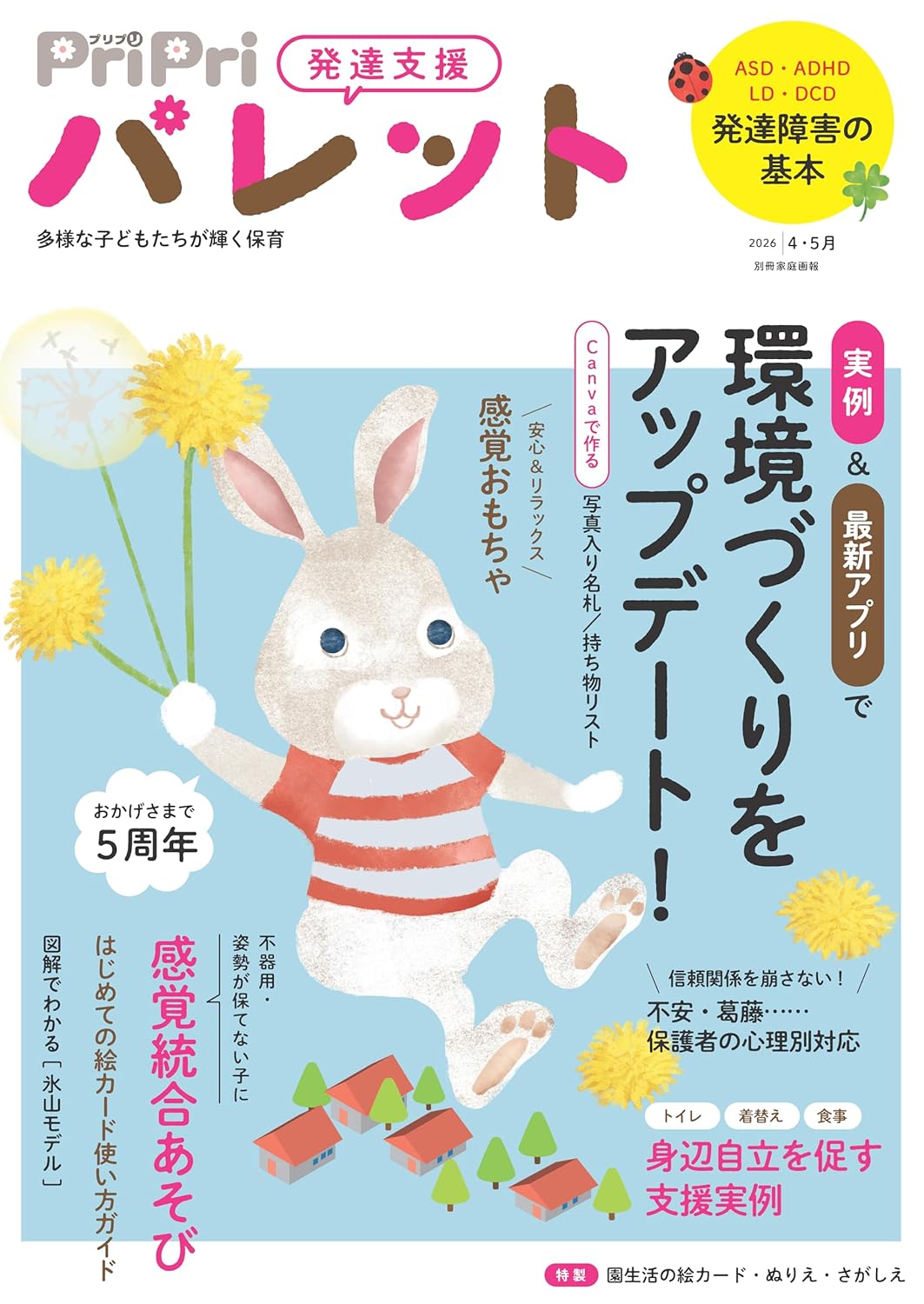 今号は、子どもが過ごしやすい環境づくり実例&最新アプリを活用した支援ツール作りを大特集! 環境の変化や初めてのことが多く、混乱しやすい新年度。園の実践例とアプリ活用を参考に、園の環境をアップデートしませんか? 第2特集では、発達支援の基本を解説。「自閉スペクトラム症(ASD)」「注意欠如・多動症(ADHD)」「学習障害(LD)」「発達性協調運動症(DCD)」の4つの発達障害の主な特性と対応のヒントを紹介します。読み物特集では、わが子の発達に不安や葛藤、悲しみなど、様々な感情を抱える保護者の支援について考えます。