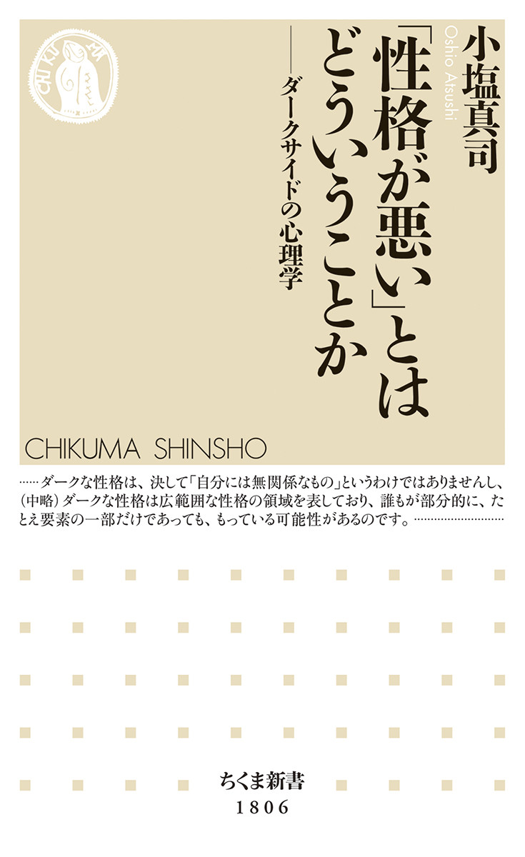 ダークな性格として、典型的なものは「マキャベリアニズム」「サイコパシー」「ナルシシズム」「サディズム」の四つである。それぞれの特性、測定方法を紹介、また仕事の相性、職場での行動、人間関係、異性との付き合い方等を分析し、どんな問題に結びつきやすいか、さらにその気質は遺伝なのか、環境なのかにも迫る。「望ましくない」性格が社会で残っているにも理由があり、どんな人にもダークな面はあることも明らかにする。