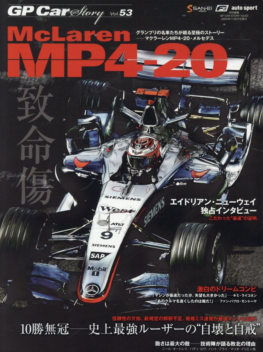 MP4-20は、年間10勝もしておきながらタイトルを獲れなかった唯一のクルマです。最速マシンでありながら、脆い、それがネックで結果、致命傷となりました。このクルマのデザイナーはニューウェイですので、今回の目玉は彼のインタビューです。巻頭8ページのボリュームで届けます。99年にハッキネンがタイトルを獲って以降、おしいところまでいけても獲れていなかった。だからニューウェイは今回のインタビューで、自分がまだ速いクルマを作れることにこだわったと語っています。速さがあっても脆いクルマ、その実情を語ってもらうために、今回も多くの技術者たちに話を聞いています。ニール・オートレイ、パディ・ロウ、パット・フライ、メルセデスエンジンのマリオ・イリエンなど。当時はセナプロ以来のジョイントNo.1として注目を集めたライコネンとモントーヤのコンビ。もちろんふたりのインタビューはありますが、この年はモントーヤが負傷欠場があって、リザーブでありテストドライバーのブルツやデラロサも乗っているので、彼らにも声を聞いています
