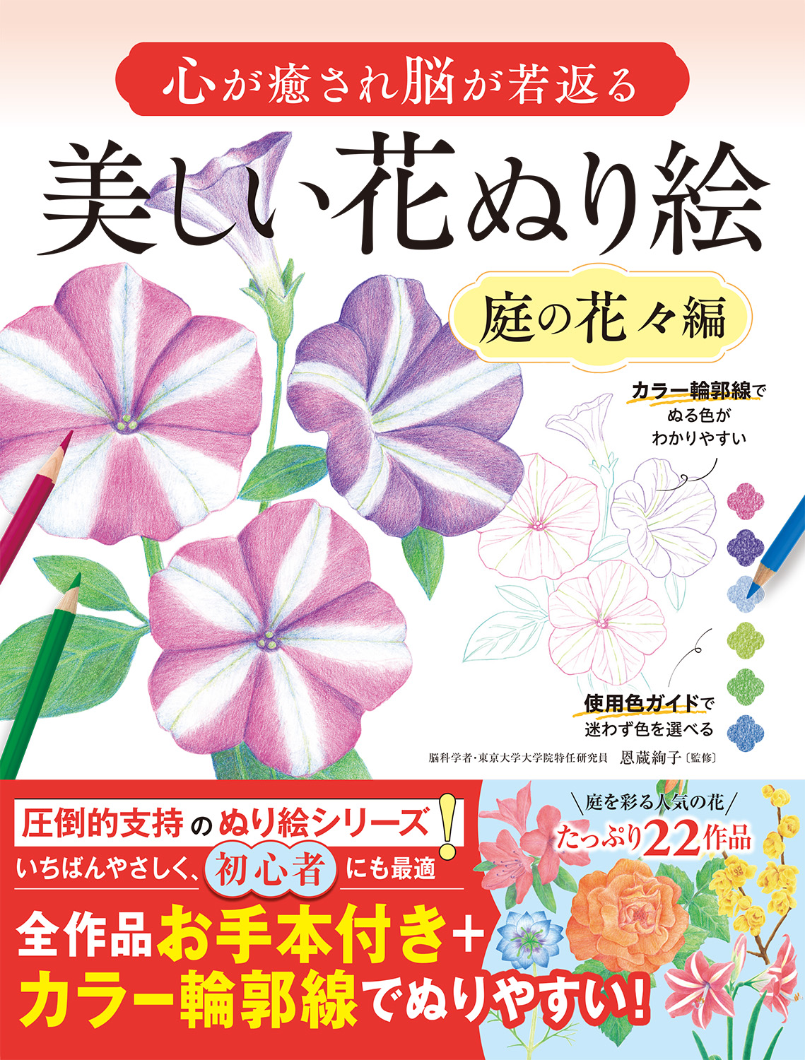 また、右ページのぬり絵の花は、カラー輪郭線で描かれているため、高齢者がどこを何色で塗るとよいかのガイドになっている点も、わかりやすいポイント。