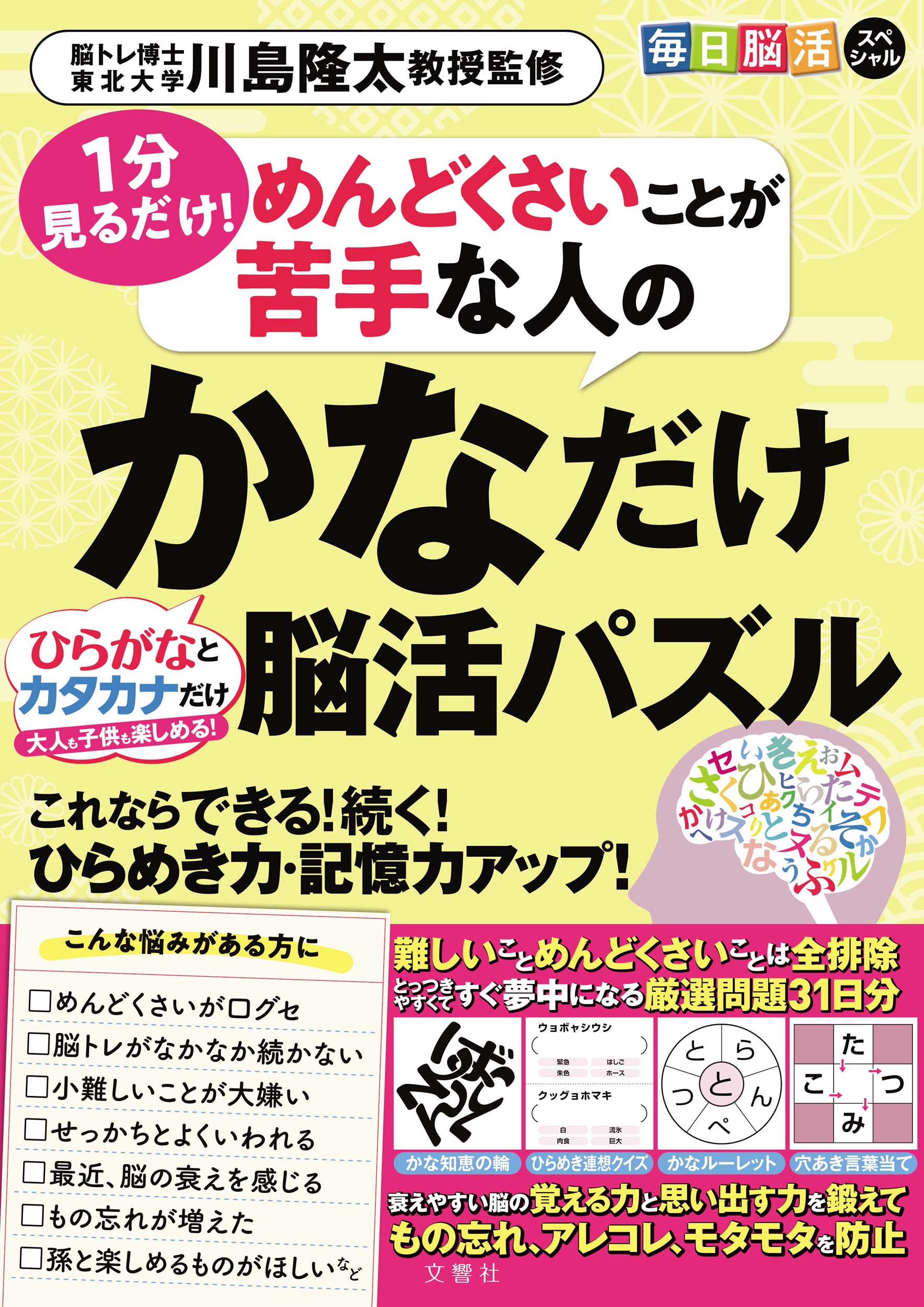 そこでおすすめなのが「めんどくさいことが苦手な人のかなだけ脳活パズル」。ひらがな・カタカナだけで構成されたストレスフリーな問題構成で、子供からお年寄りまで楽しく取り組むことができる、1日2ページ31日分のドリルです。