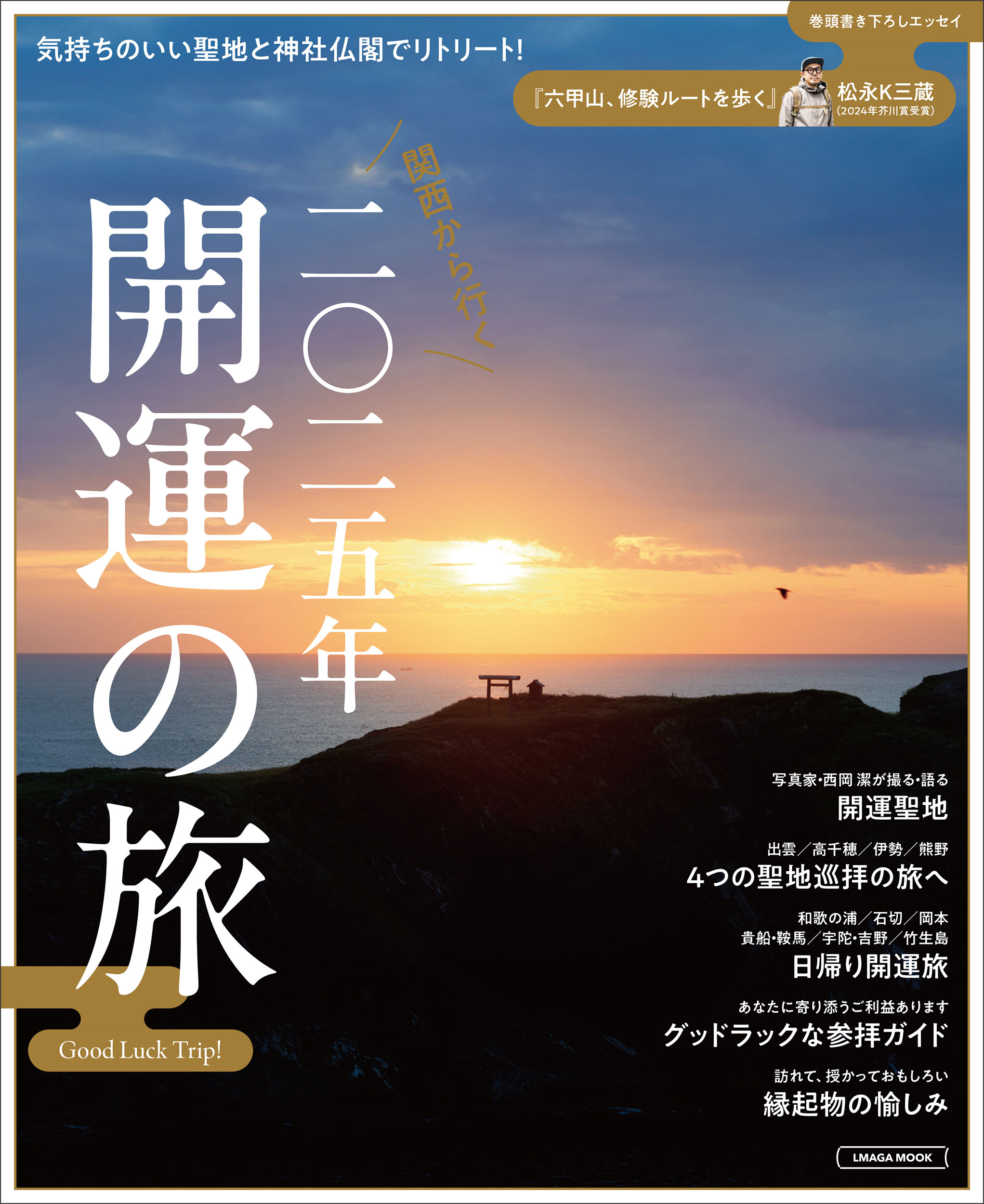 出雲・高千穂・伊勢・熊野といった西日本を代表する聖地、さらに日帰りで訪れたい近隣の神社仏閣を、豊富な立ち寄りとともに紹介する一冊。2025年の干支である巳を祀るお社や、金運・健康などにご利益のある神社仏閣を紹介するほか、旅を面白くする縁起物の楽しみ方もご紹介。なんと巻頭には、第171回芥川賞を受賞した作家・松永K三蔵さんによる書き下ろしエッセイも!