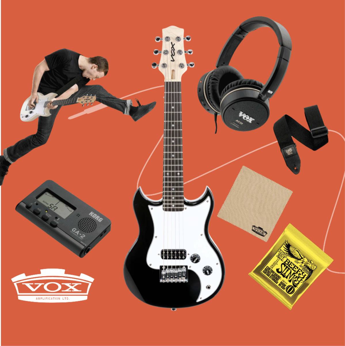 コンパクトで気軽に弾けるミニエレキギターセット。ちょっとした練習やおうち時間、お出掛け用ギターにお勧めです。セット内容・ギター SDC-1 MINI (BLACK/RED/WHITE)・ヘッドホンアンプ VGH-AC30・チューナー GA-2・ストラップ EB 4037 POLYPRO STRAP BLACK・弦 EB 2627 BEEFY SLINKY・クロス VOXロゴ刺繍入りクロスSDC-1 MINIギターをもっと身近に! いつでもどこでも演奏したくなるミニギター、SDC mini。リビングに溶け込むルックスの可愛さ、どこへでも持ち運べるコンパクトさ、そして楽器としての高い演奏性も持ち合わせたミニギター、それがSDC mini。475.7 mmというショート・スケールながらレギュラー・チューニングに対応し、通常のエレクトリック・ギターと同じ感覚での演奏が可能です。手の小さな女性やお子様にもオススメのSDC miniは、ギター演奏の敷居をグッと下げ、どんなシチュエーションでも演奏することが楽しくなる一本です。VGH-AC30いつでも、どこでも、気軽に演奏を楽しめる。VGH ギター・アンプリファイアー・ヘッドホン。VGHシリーズは、自宅やリハーサル・スタジオ、屋外でもギター/ベースに接続するだけで演奏を楽しむことができるヘッドホン型のギター/ベースアンプです。電源をオフにすると、通常のヘッドホンとしても使用でき、あらゆるシチュエーションで活躍します。VGH-AC30はAC30特有のチャイミーさにフォーカスしました。ギターのボリュームを絞った時はきらびやかなクリーンに、上げた時はより前にでるクランチ・サウンドです。スペックSDC-1 MINI・ボディ:ポプラ・ネック:メイプル・スケール: 479mm (18 3/4″) 19フレット・フレット:ミディアム・ジャンボ・フレット・フィンガーボード:パープルハート・ナット幅:42mm (1.654″)・ピックアップ:ミニ・ハンバッキングピックアップ ×1・コントロール:1ボリューム、1トーンVGH-AC30? ヘッドホン部 ?・タイプ:密閉式ダイナミック・ドライバー径:40mm・出力音圧:97dB・再生周波数特性:20Hz〜20kHz・最大入力:1,000mW・インピーダンス:49Ω・ケーブル長:1.6 m? アンプ・セクション ?・コントロール:Gain、Tone、Volume、Effect(ノブ)、Standby(スイッチ)・接続端子:インプット・プラグ(6.3mm ステレオ・フォーン・プラグ)、AUX IN 端子(3.5mm ステレオ・ミニフォーン・ジャック)・電源:単四乾電池x2・電池寿命:AC30 :約7時間(マンガン乾電池)、約16時間(アルカリ乾電池)・外形寸法:195 (W) x 160 (D) x 50 (H) mm・質量:230g(電池含まず)・付属品:単四乾電池x2(動作確認用)