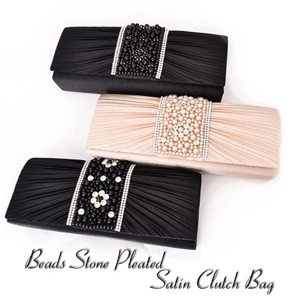 レディース クラッチバッグ ビーズストーン プリーツ サテン ショルダー 結婚式 パーティー 二次会