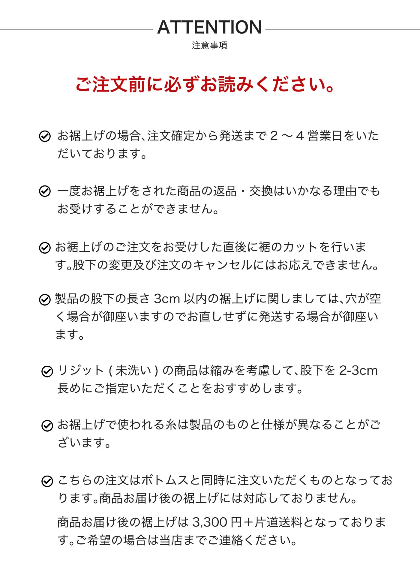 ・お裾上げのご注文をお受けした直後に裾のカットを行います。股下の変更及び注文のキャンセルにはお応えできません。