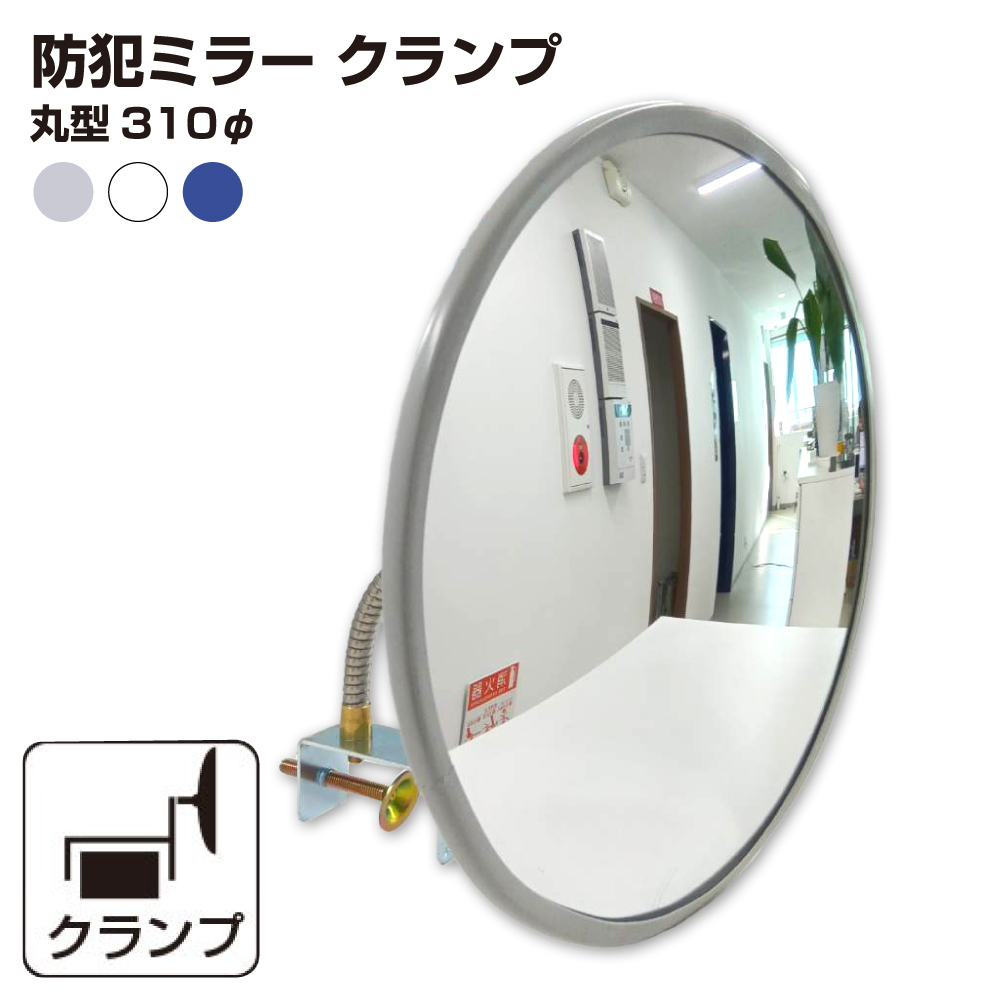 カーブミラー 室内 防犯ミラー 丸型 310φ フレキシブル アーム フレキ クランプ 挟み込み 防犯 屋内 棚 有効幅13 ~ 65mm アクリル製 グレー 白 青 日本製 yh038