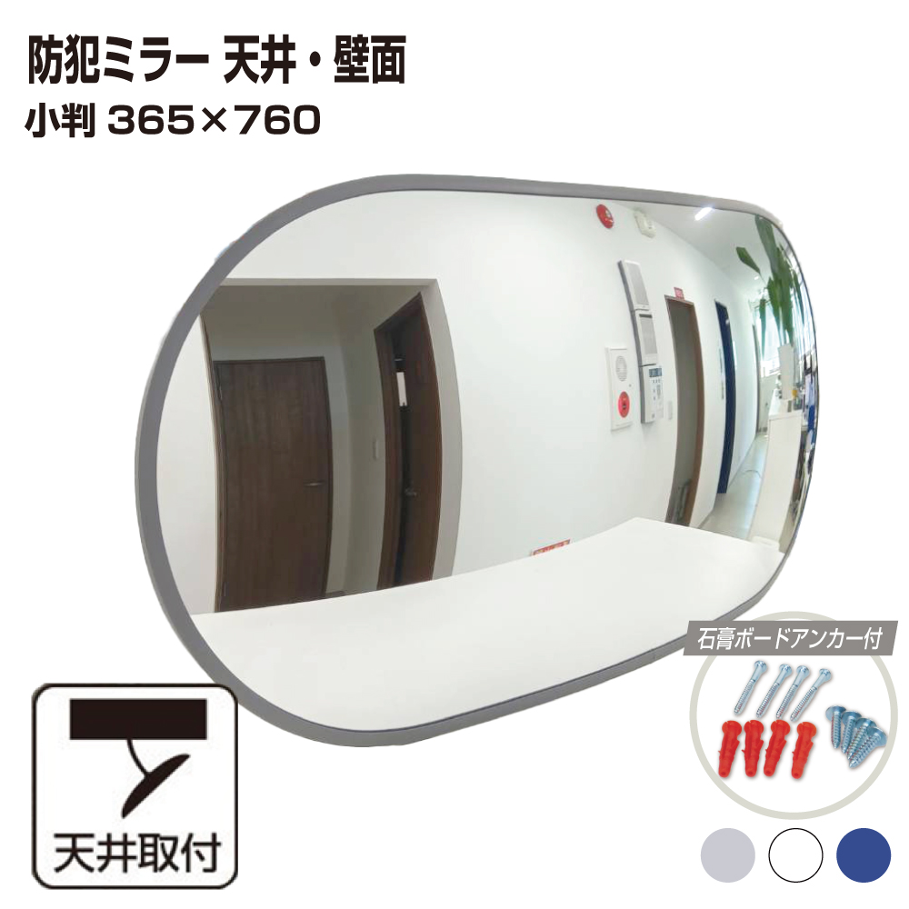 カーブミラー 室内 防犯ミラー 小判 365×760mm フレキシブル アーム ビス止め 防犯 屋内 天井 壁面 店舗 業務用 アクリル製 グレー 白 青 日本製 yh068