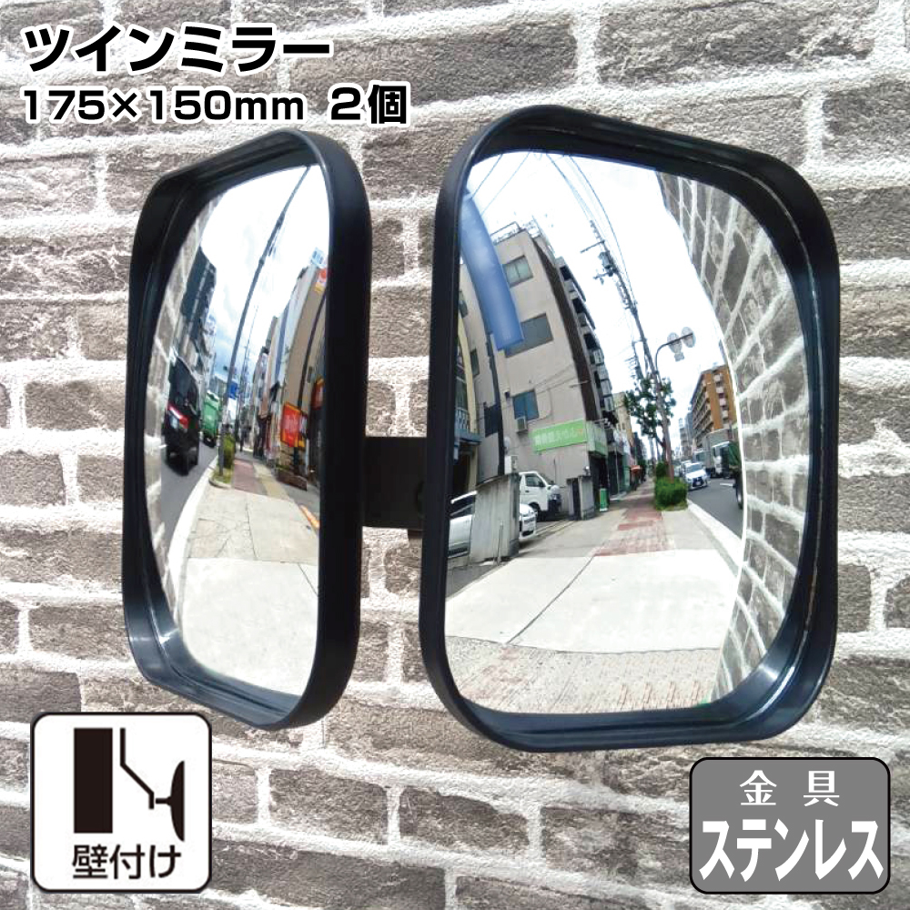 ガレージミラー カーブミラー 2面鏡タイプ 壁付け 壁面 金具 ステンレス製 さびない 黒色 角型 175×150mm 取付金具付き ガラス製 ツイン 日本製 HTS-5S yh1432