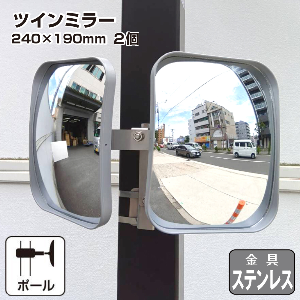 ガレージミラー カーブミラー 2面鏡タイプ 金具付 ステンレス製 さびない グレー色 角型 240×190mm ベルト取付式 ステンレスベルト 40cm/120cm ガラス製 yh1478