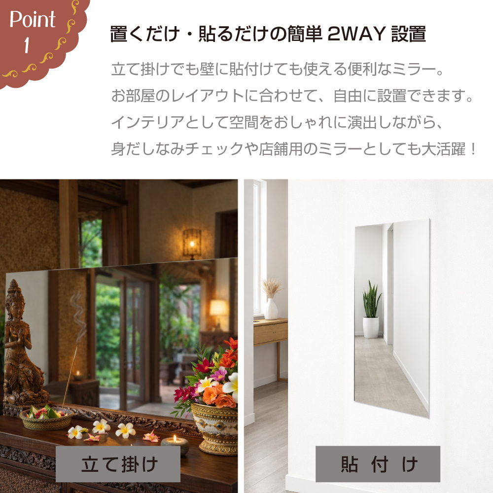 安全性にも配慮されており、切断面は安全加工が施されています。これにより、安心してお使いいただけます。設置方法は、貼り付けと立て掛けの2通りが可能で、設置場所や用途に応じて柔軟に対応できます。