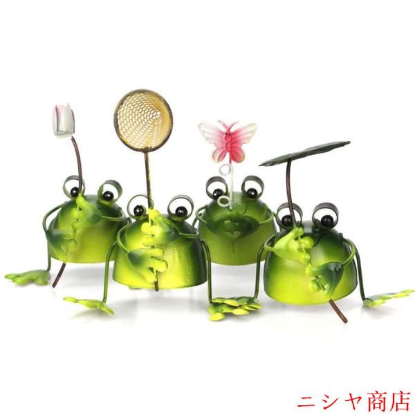 幸運をもたらす 4匹の小さなカエル プチ 置物 プレゼント インテリアとしても最高 ブリキ で作られた かわいい 蛙 の オブジェ (葉、網、花、蝶)