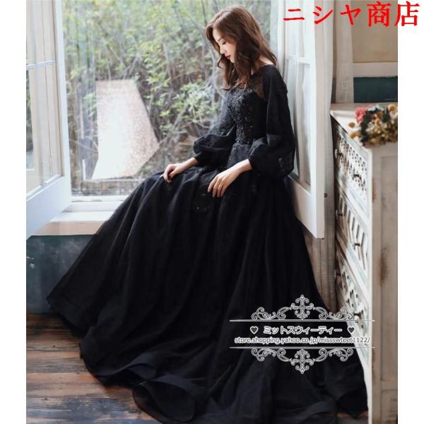 カラードレス カクテルドレス 長袖 ブラック 黒 ロングドレス パーティードレス 発表会 演奏会 ステージドレス イブニングドレス フォマール ファスナー
