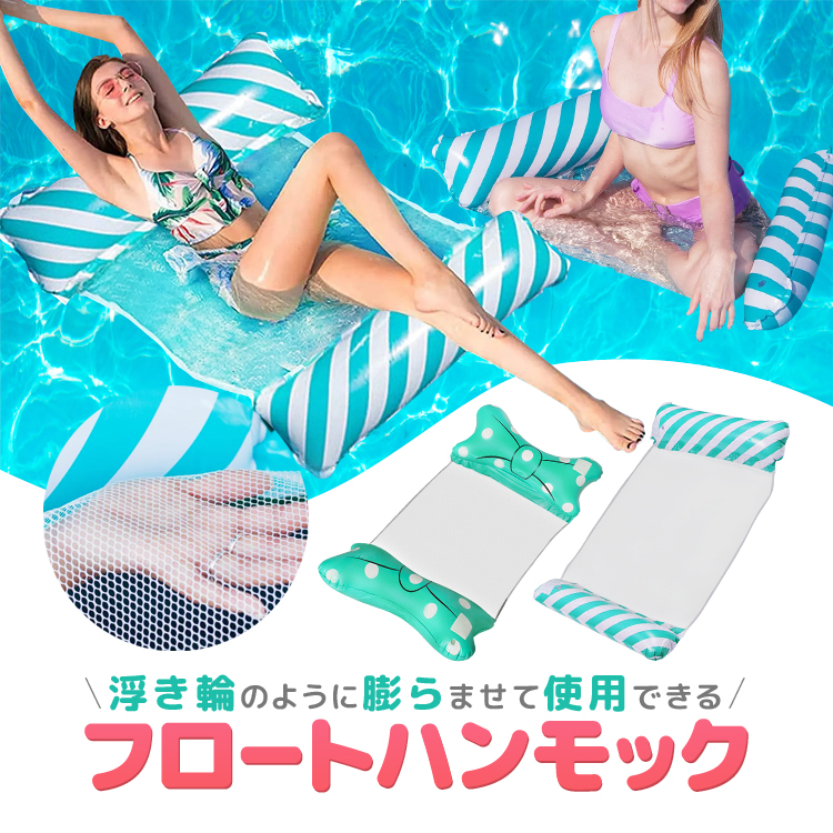 浮き輪のように空気を膨らませて使用できるフロートハンモックです。