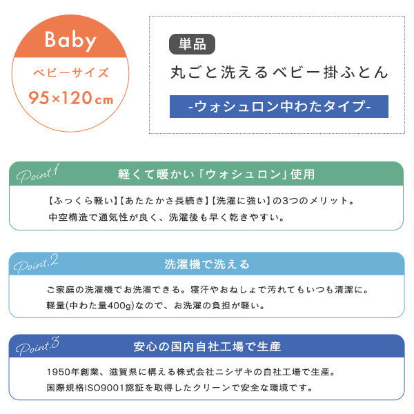 商品説明:お家の洗濯機で丸ごと洗える。日本製のベビー掛ふとん。
