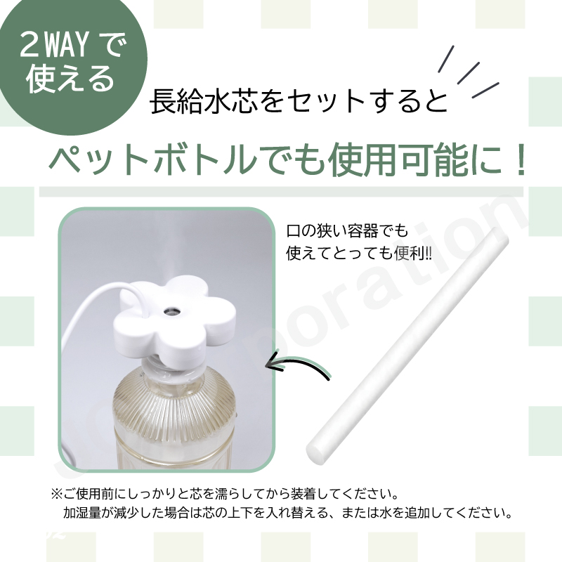 付属の長給水芯(200mm×8mm)を装着すれば、ペットボトルでも使えてとっても便利。