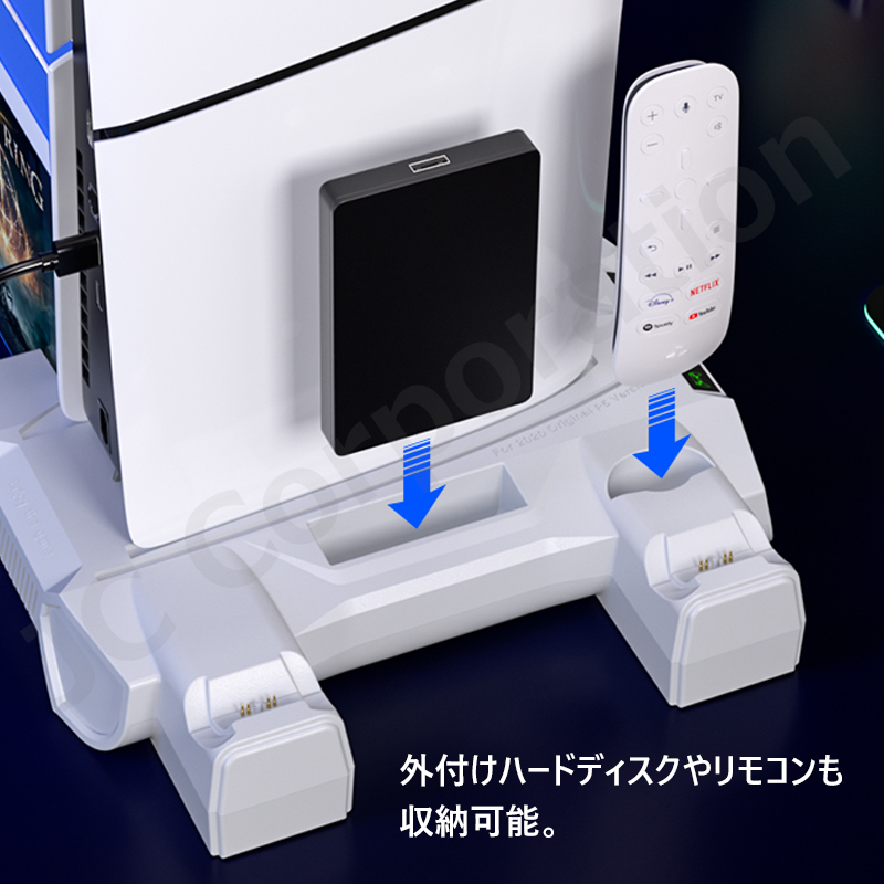 ソフト収納スタンド最大12枚収納可能なスタンドも搭載。リモコン収納スペース、外付けハードディスクの収納スペースもあり、付属品もすっきり収納できます。