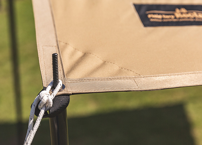 ハトメの数が多いので天候に応じた様々な張り方ができ、火の粉にも強いため焚き火も楽しめます。