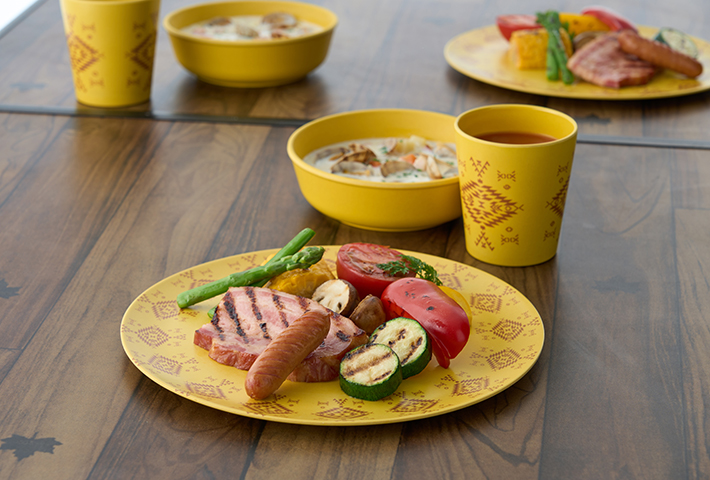 LOGOS LAND柄をあしらったプレートで、食卓を華やかに彩る LOGOS LAND柄がデザインされており、盛り付けられた食材をより引き立てます。