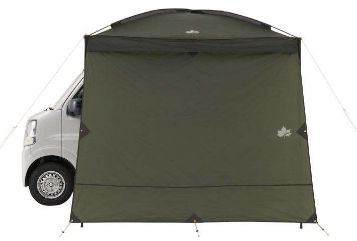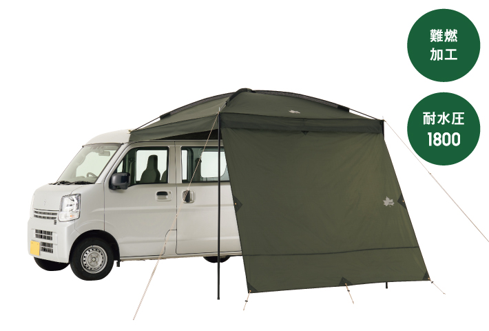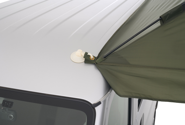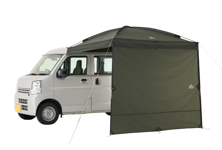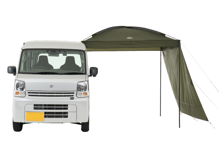 付属の吸盤式ジョイントで車に手軽に連結できる広々としたタープ。