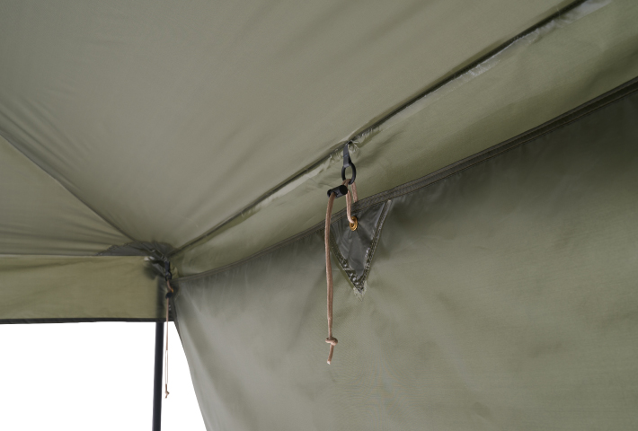 生地は防水・難燃加工済で、パネルルーフを採用しているので雨水が溜まりにくい。