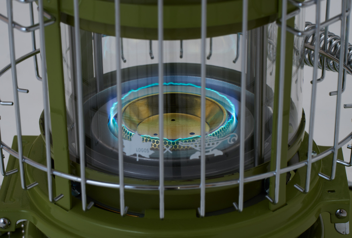 コラボ限定モデルは自然なグリーンの色合いが特徴的で、LOGOSのパノラマガラス構造により、360°全方向から炎を楽しむことができるのも魅力。