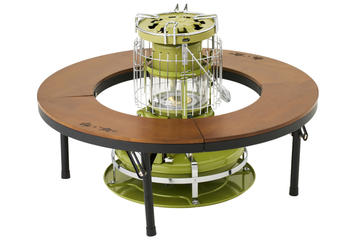 別売りの木製天板の円形テーブル、「LOGOS×ALADDIN ストーブテーブル」と組み合わせてカスタマイズも楽しめます。