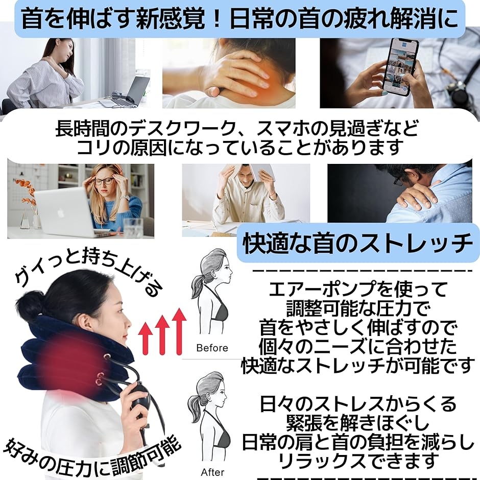「首を伸ばす新感覚。日常の首のコリや疲れに」 デスクワークやスマートフォンの使用によって、知らず知らずのうちに首のコリが蓄積していませんか? このネックストレッチャーは、エアーポンプを使って空気を注入し、首の負担を軽減しながら優しく伸ばす画期的なアイテムです。