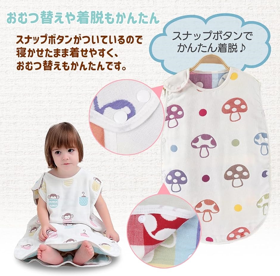 「商品仕様」 ・size:Mサイズ 身幅約 40cm,着丈約 60cm Lサイズ 身幅約 45cm,着丈約 80cm ・年齢:新生児〜4歳位(お子様の体格により変わります) ・素材:綿 100% ・どの柄にも、右肩に2つボタン、胴体部分の左右に3つずつボタン、股下部分に1つボタンがついています。