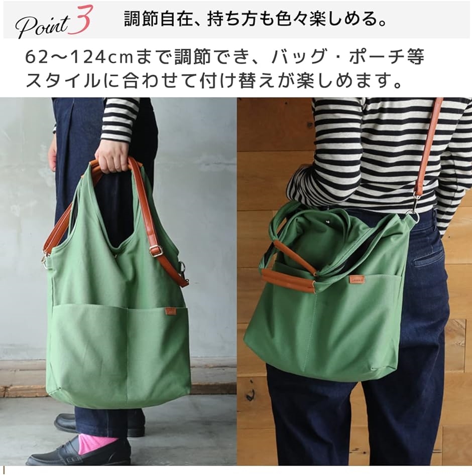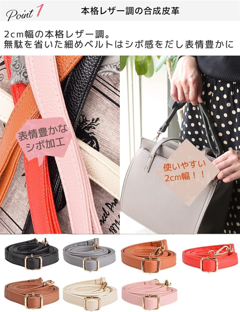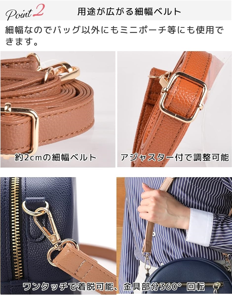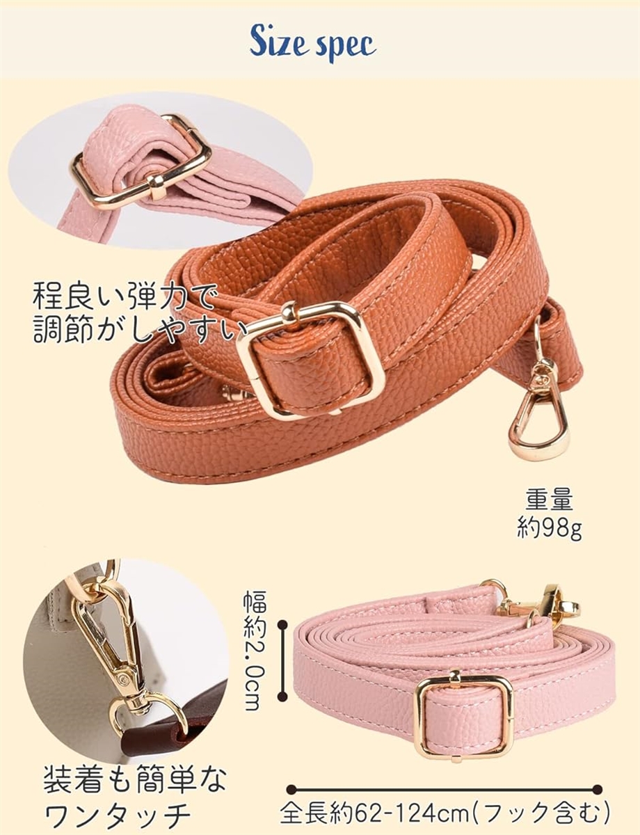 ・ショルダー紐長さ約62〜124cm(フック含む)、ベルト幅約2.0cm、厚み約5mm、重さ約98g、合成皮革素材