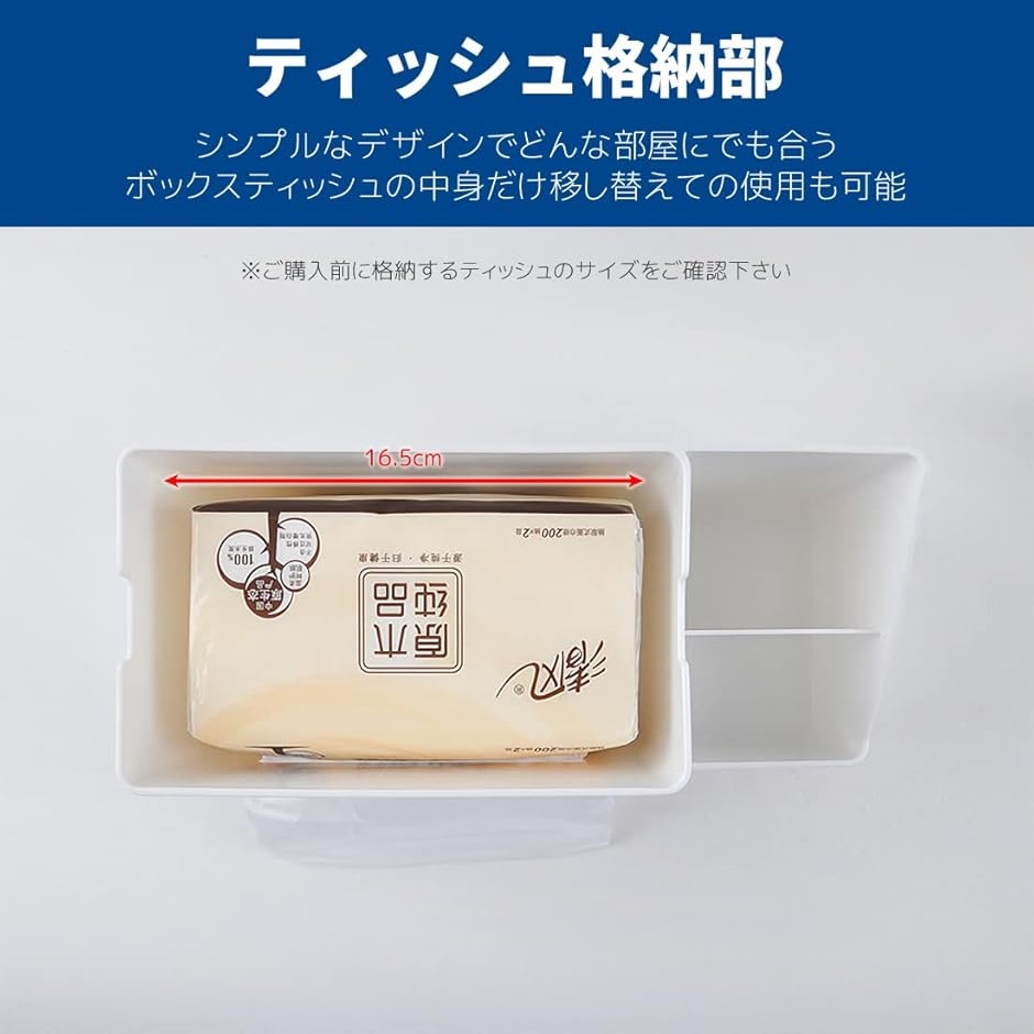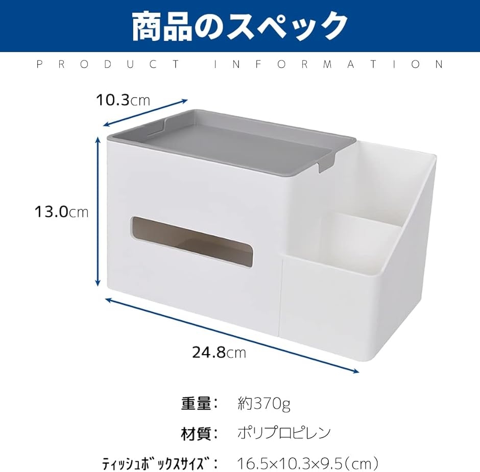 「素材、耐久性、サイズ」材質:PP 全体サイズ:24.8cm、13.0cm、10.3cm ティッシュを入れるところのサイズ:16.5cm、10.3cm、9.5cm 重量:約370g