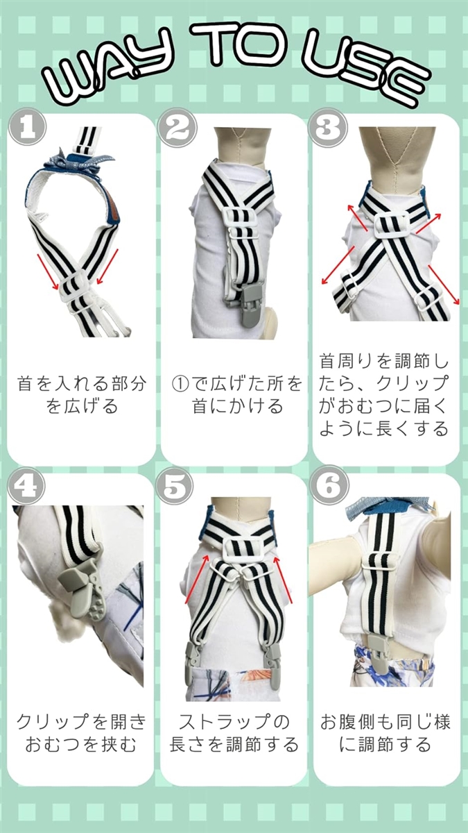 ・「用途」マナーベルトが脱げてしまうおむつが脱げてしまう、そんな時に脱げ防止に使用するサスペンダーです。