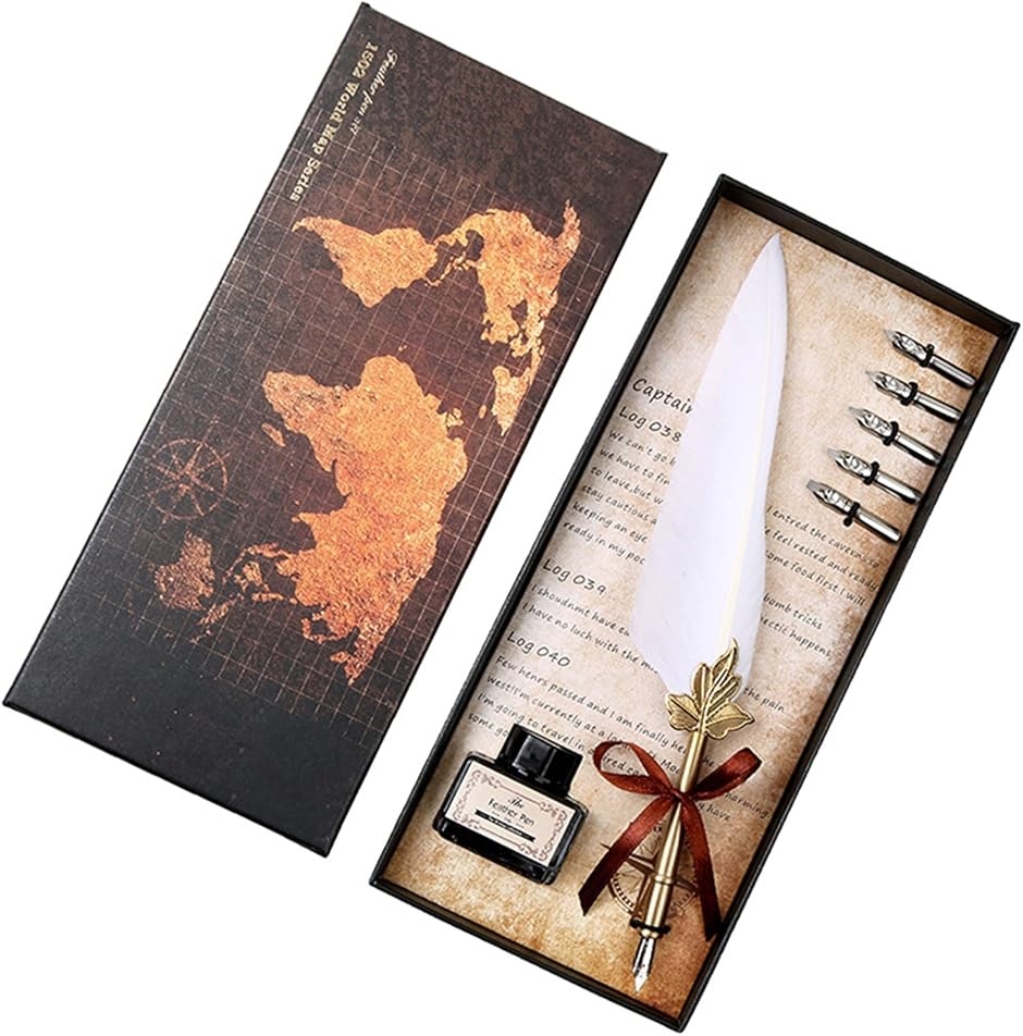 羽根ペン1本、交換用ニブ(ペン先)5種5本、インクボトルの7点をセットにしアンティークなギフトボックスにセットしてお届けいたします。