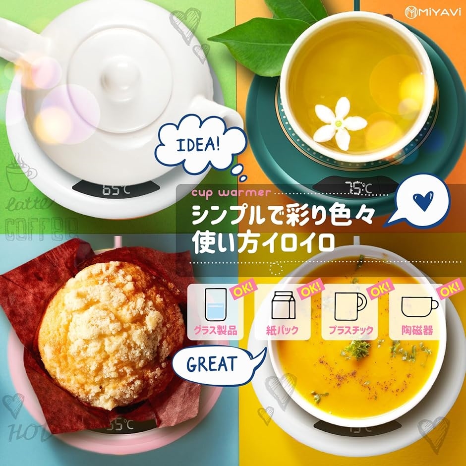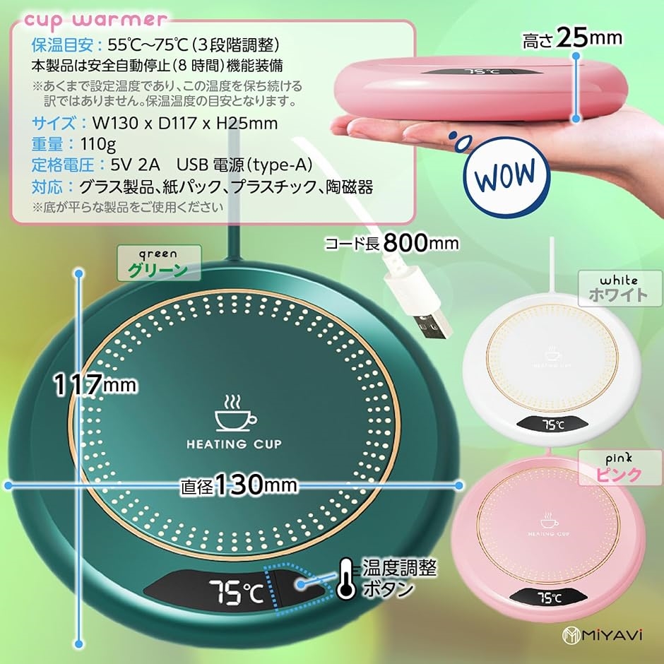 | 商品名 | カップウォーマー コーヒーウォーマー 保温コースター USB 55℃〜75℃3段階切り替え 8時間自動電源オフ機能 緑 |