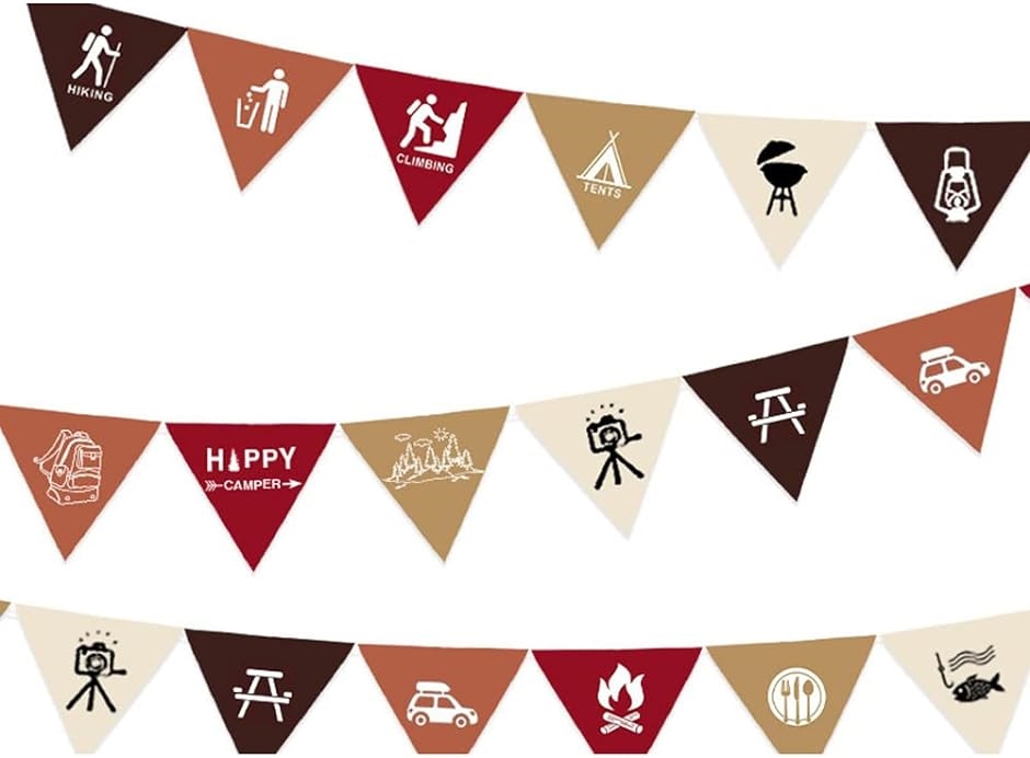 「フラッグガーランド」アウトドア好きな人必見。ランタン、バーベキューグリルなどの可愛いイラストがデザインされた布製のガーランドです。