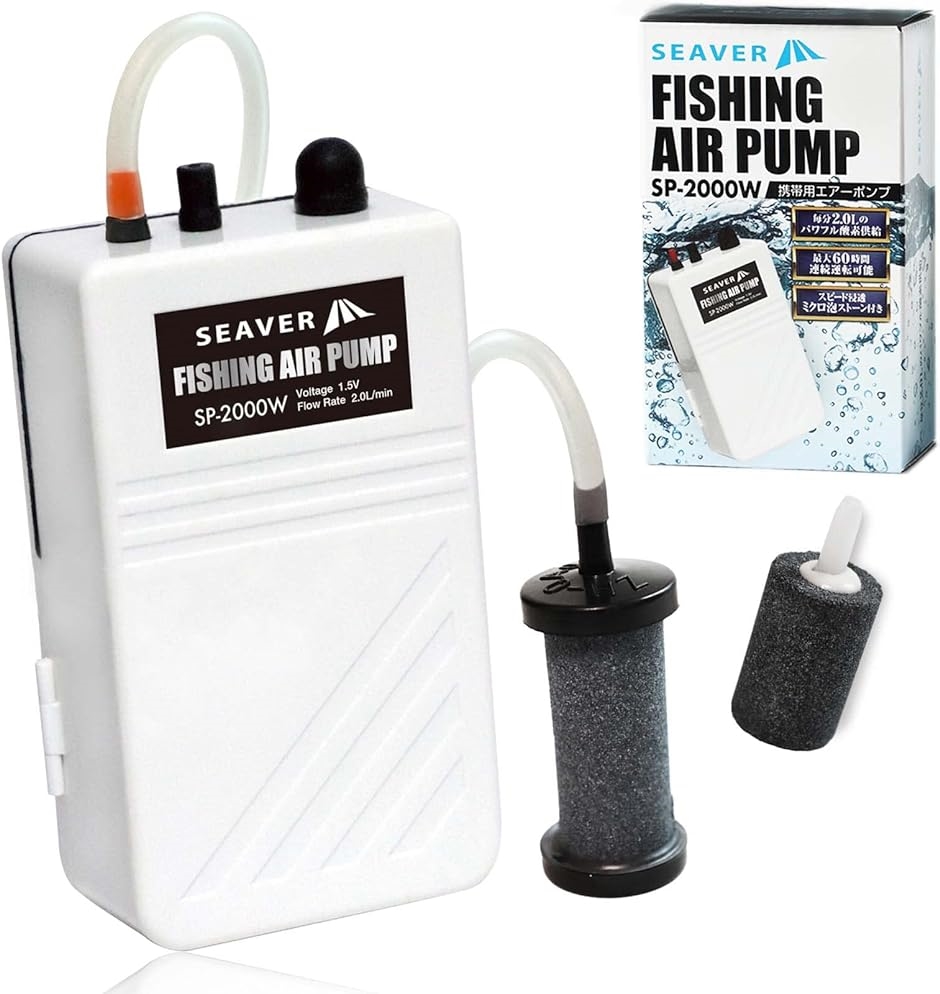 | 商品名 | 長時間ミクロ泡供給エアーポンプ 釣り 乾電池式 高耐久ストーン ラバータイプ ホワイト スペア付き 単一2個タイプ ブクブク SP-2000B |